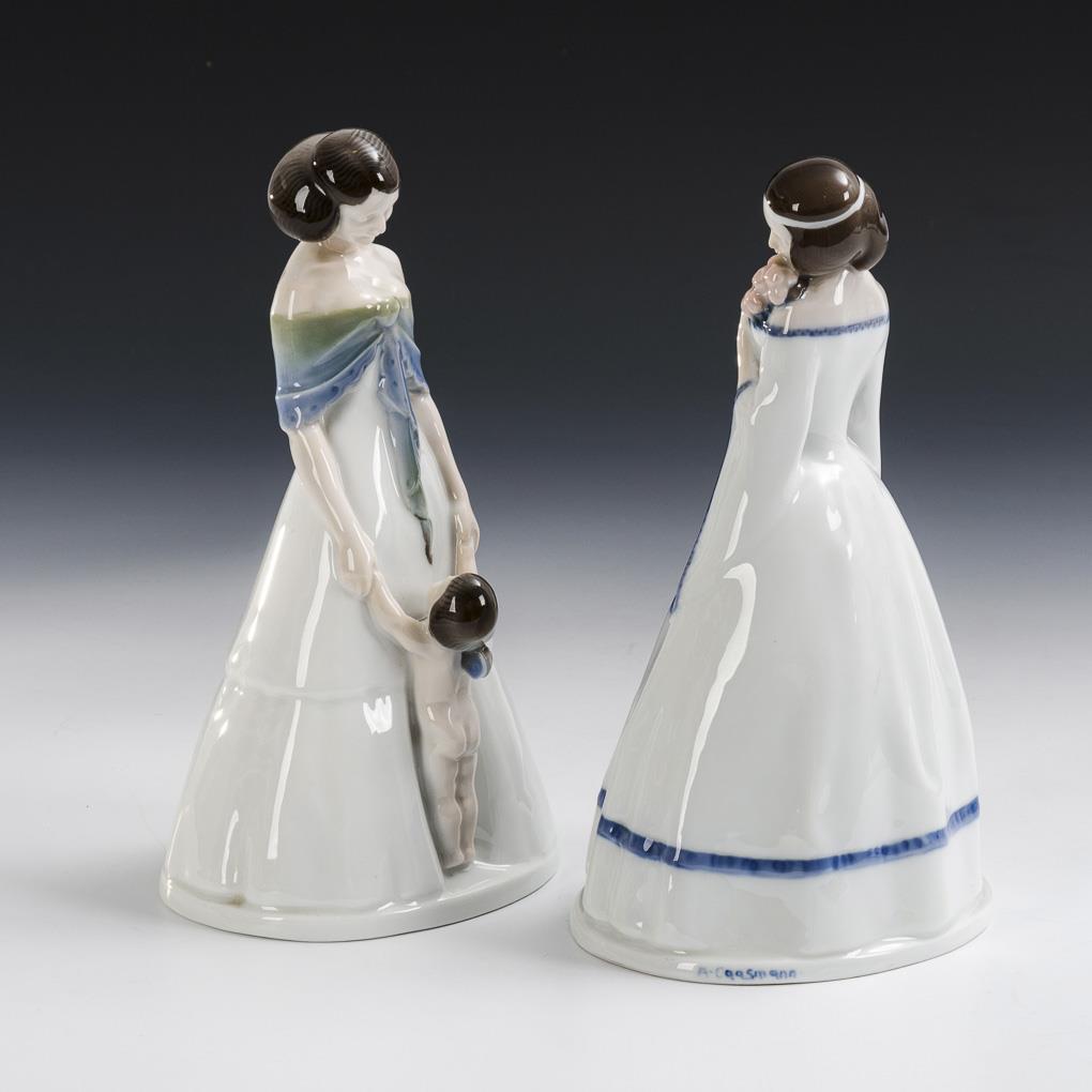 1x model no. K 304: Art Nouveau sculpture of a young woman in a long dress, holding a small elf by the hands / 1x model no.: K 303: standing young woman, smelling a bouquet of roses.