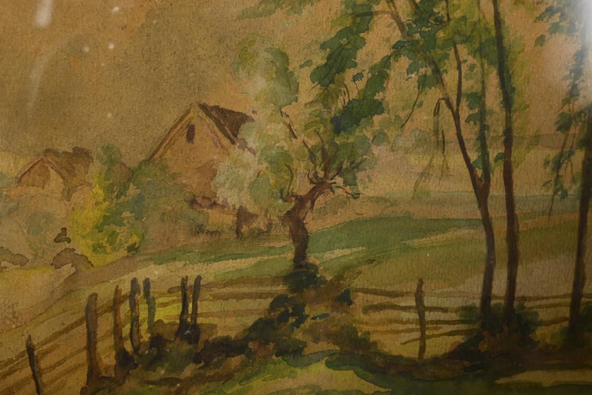 Village landscape with farmstead and staffage figures in the shade of trees.