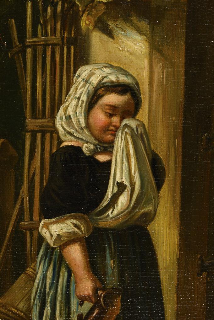 Girl crying at the entrance to the house with the remains of a jug in her hand.