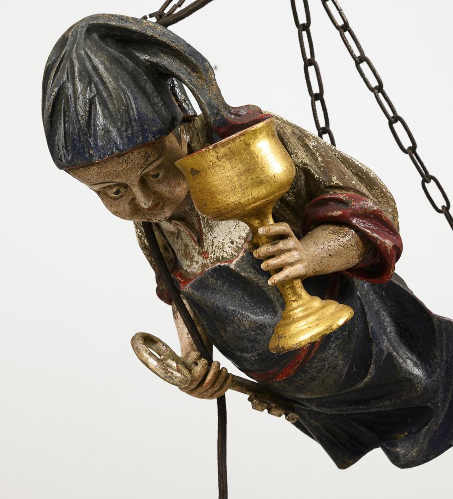 1-light hanging lamp on a chain suspension in the style of a female chandelier, with a fully sculpted, polychrome figure of a miller, holding a key and chalice in his hands; with a hanging tulip-shaped glass shade made of green iridescent glass. Fitting rubbed; lamp attached later.