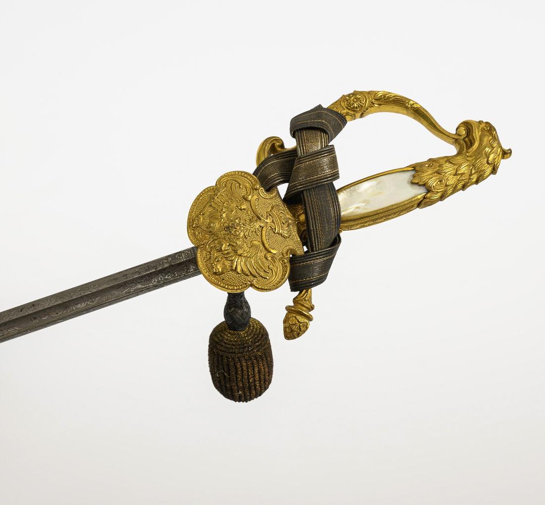 Straight single-edged blade with etched pattern, brass hilt with mother-of-pearl grip and eagle's head. Eagle in relief with the monogram "WR II" on the guard plate. Leather scabbard dyed white. Comes with portepee. Scabbard with heavy signs of age.