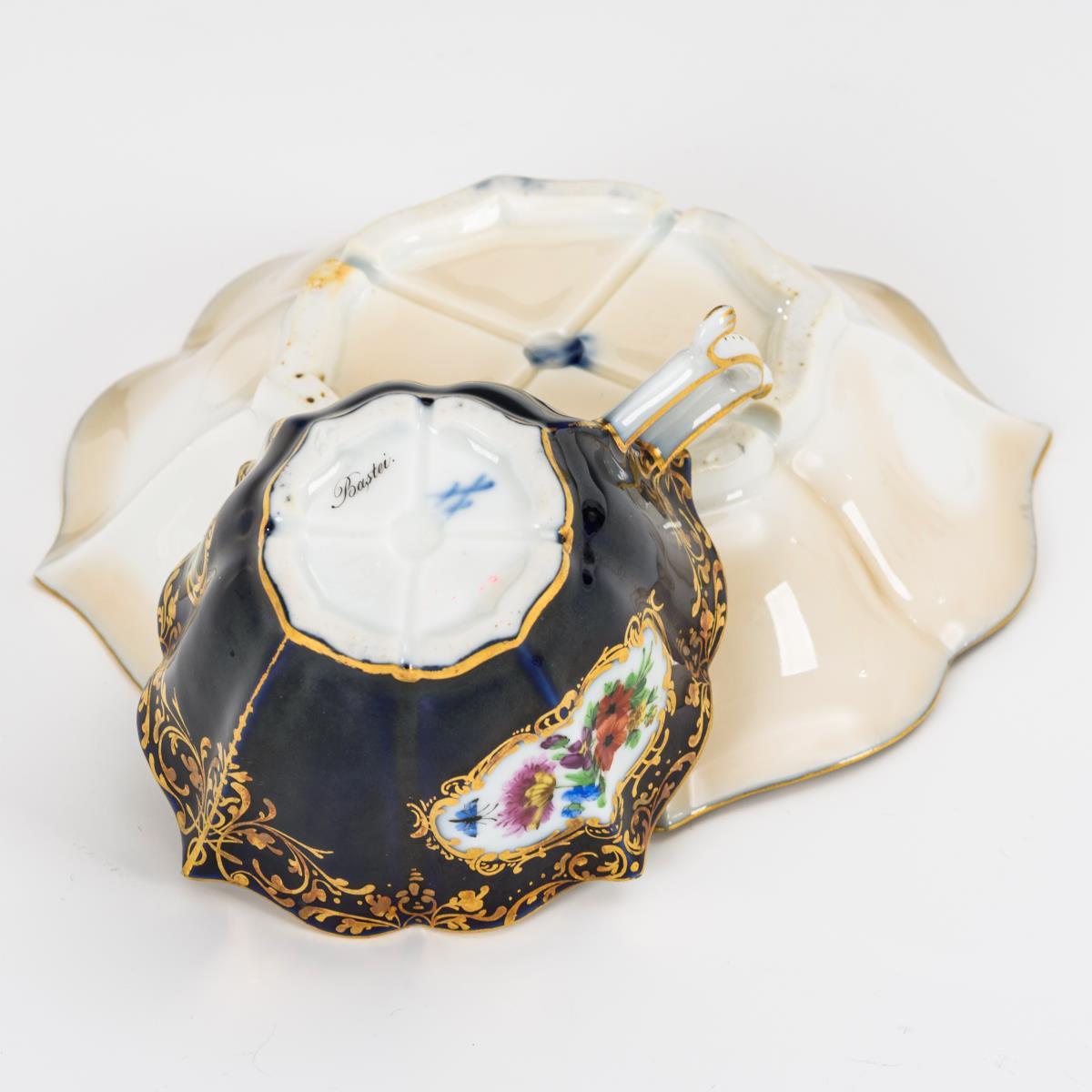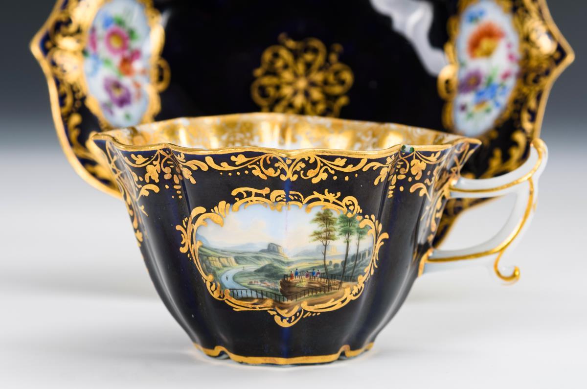 Vierpasstasse mit spitz gewinkeltem Henkel. Schauseitig die unterseitig bezeichnete Ansicht der Bastei im Elbsandsteingebirge.