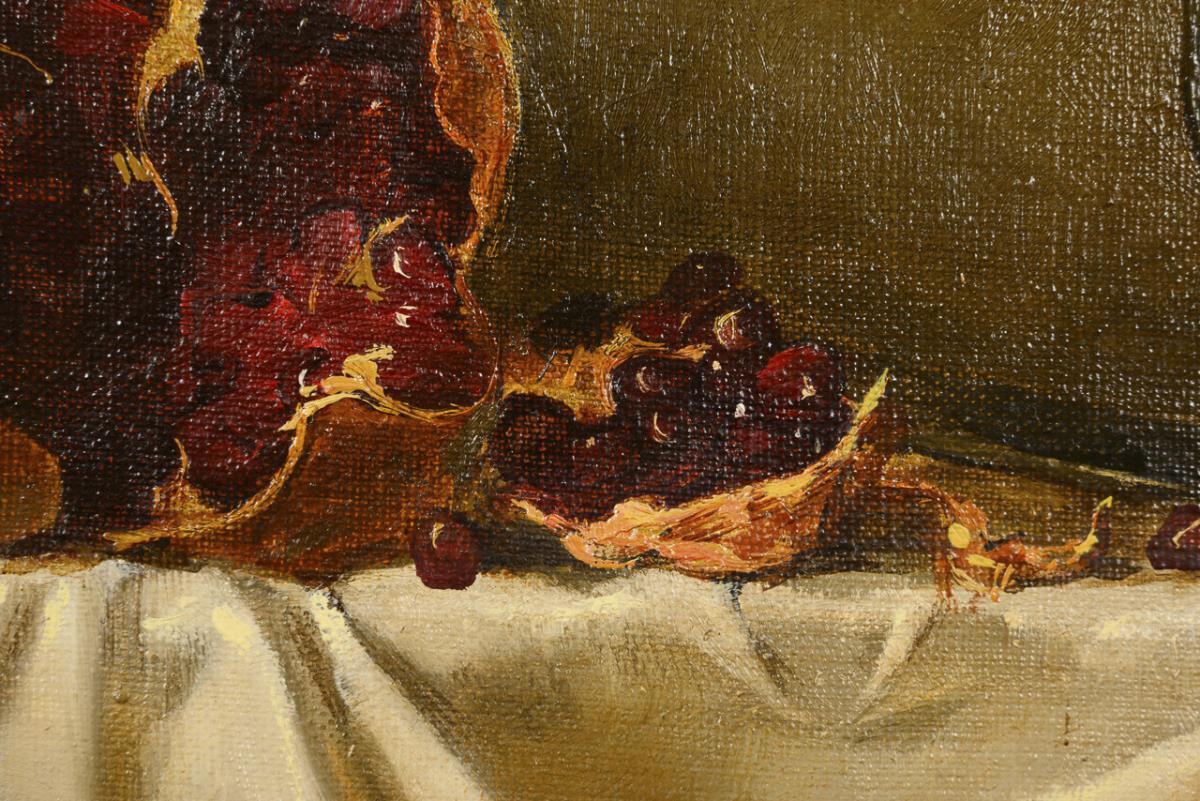 Still life painted in the style of the Baroque Old Masters with broken fruit next to glass and nuts.