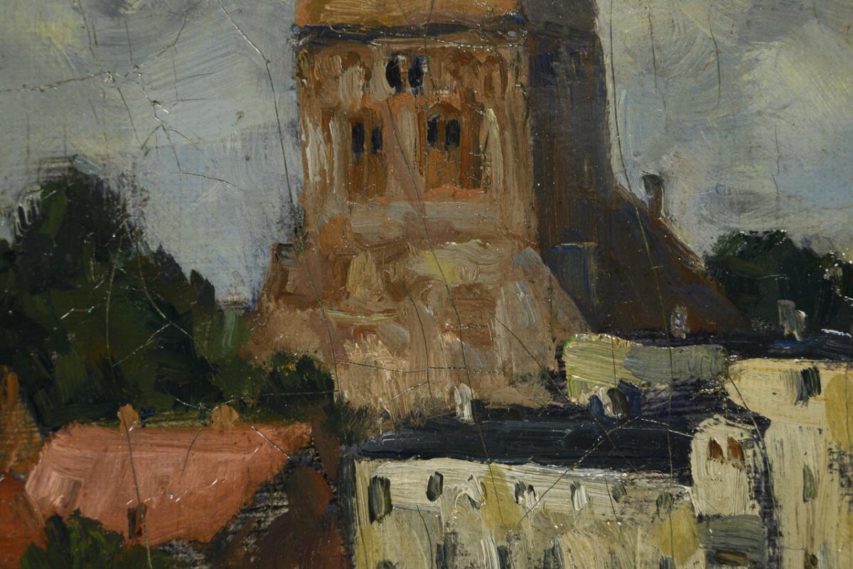 Densely packed houses with a church behind a river on a summery day. Two very small restored areas with adhesive backing.