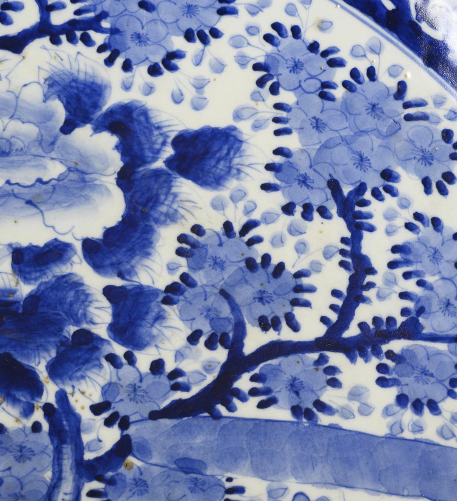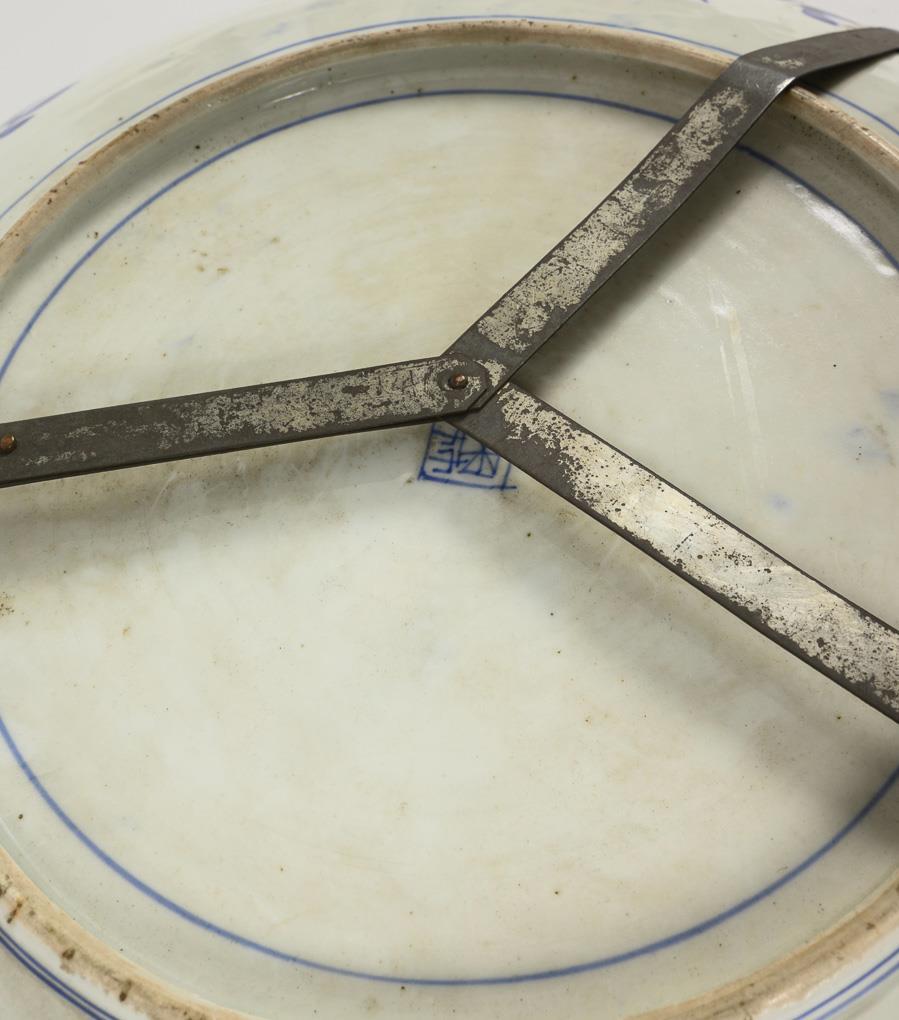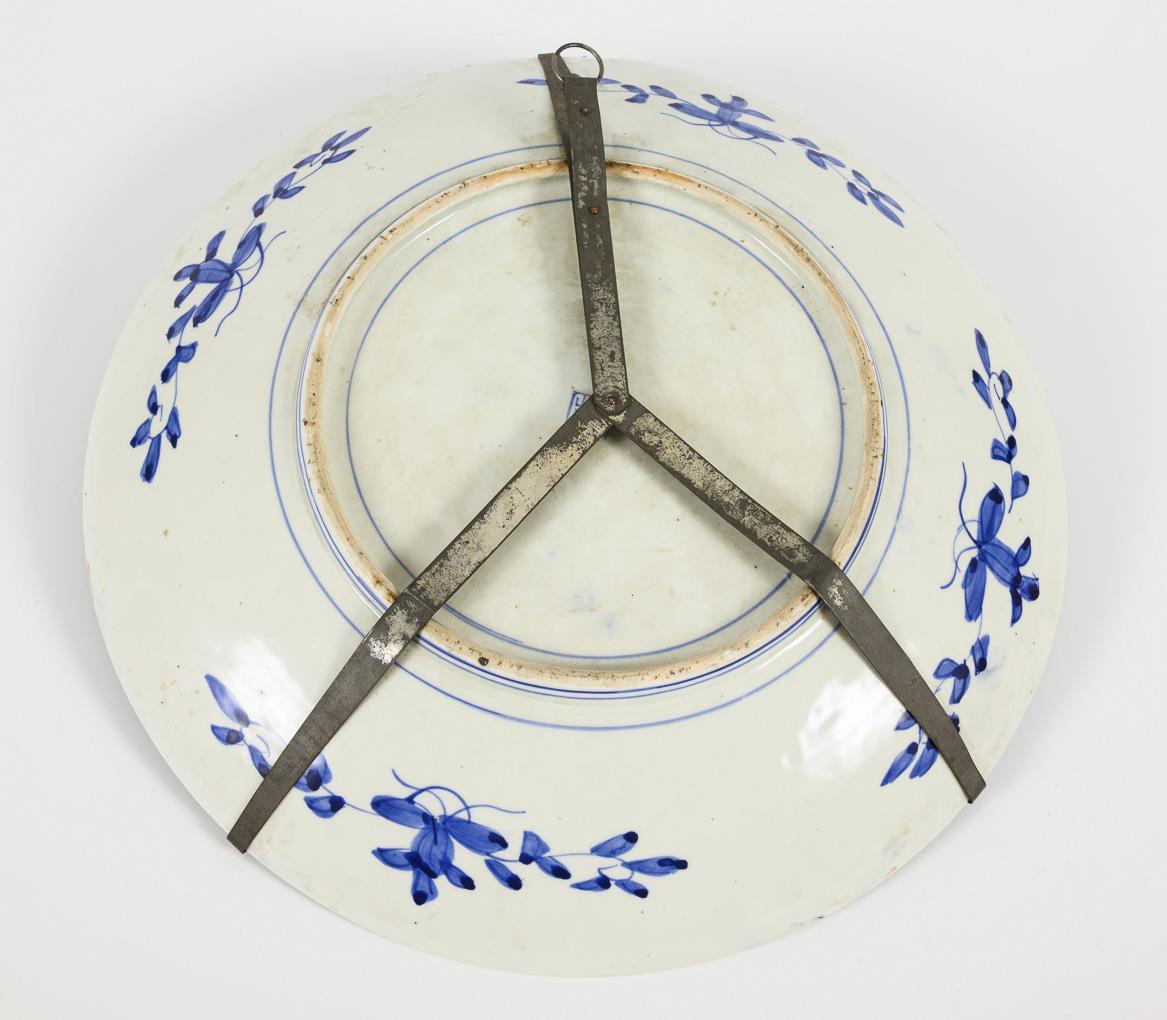 Large wall plate with underglaze blue landscape decoration.