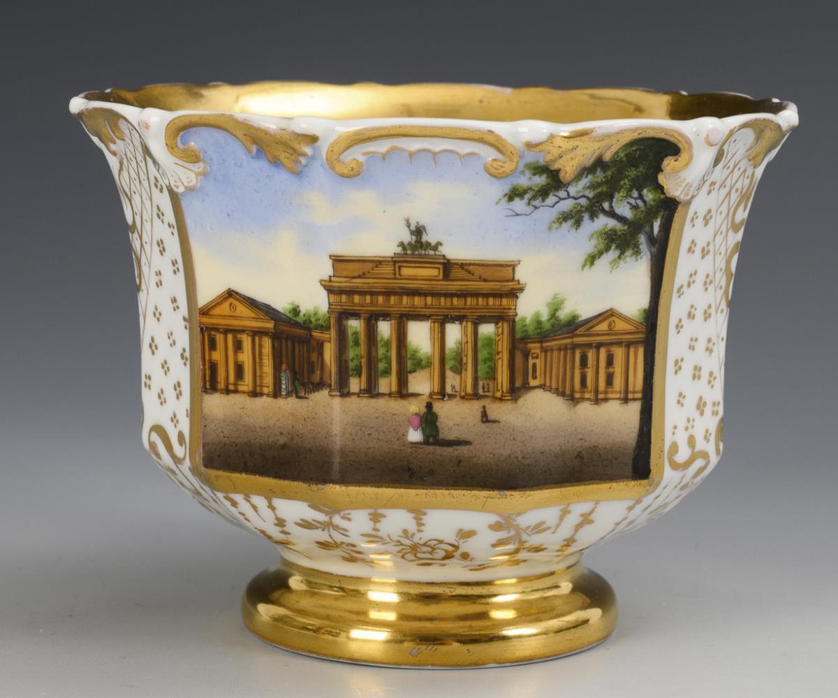 Footed, polygonal bell-shaped cup with ear-shaped handle. On the front a gold-framed rectangular cartouche with a view of the Brandenburg Gate in Berlin inscribed on the underside, verso ornamental floral gold painting. Minimal gold abrasion.