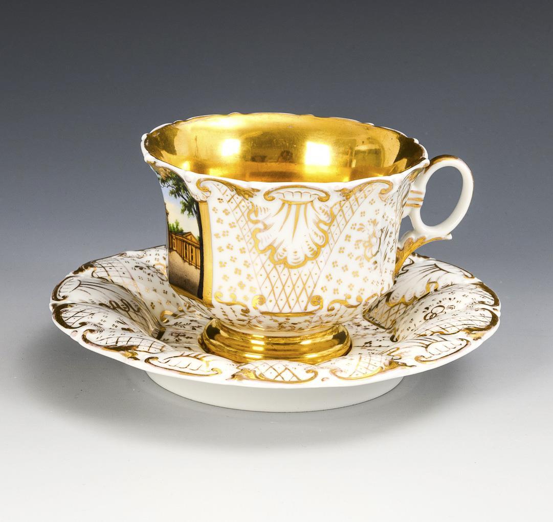 Polychrome painted, decorated in gold. Cup (h 8 cm), original saucer (Ø 17.5 cm).