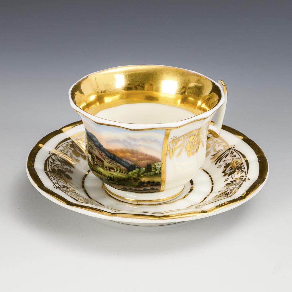 Polygonal bell-shaped cup with tapering handle. On the front a gold-framed rectangular cartouche with a view of Gräfenberg in Austrian Silesia, verso vegetal gold painting.