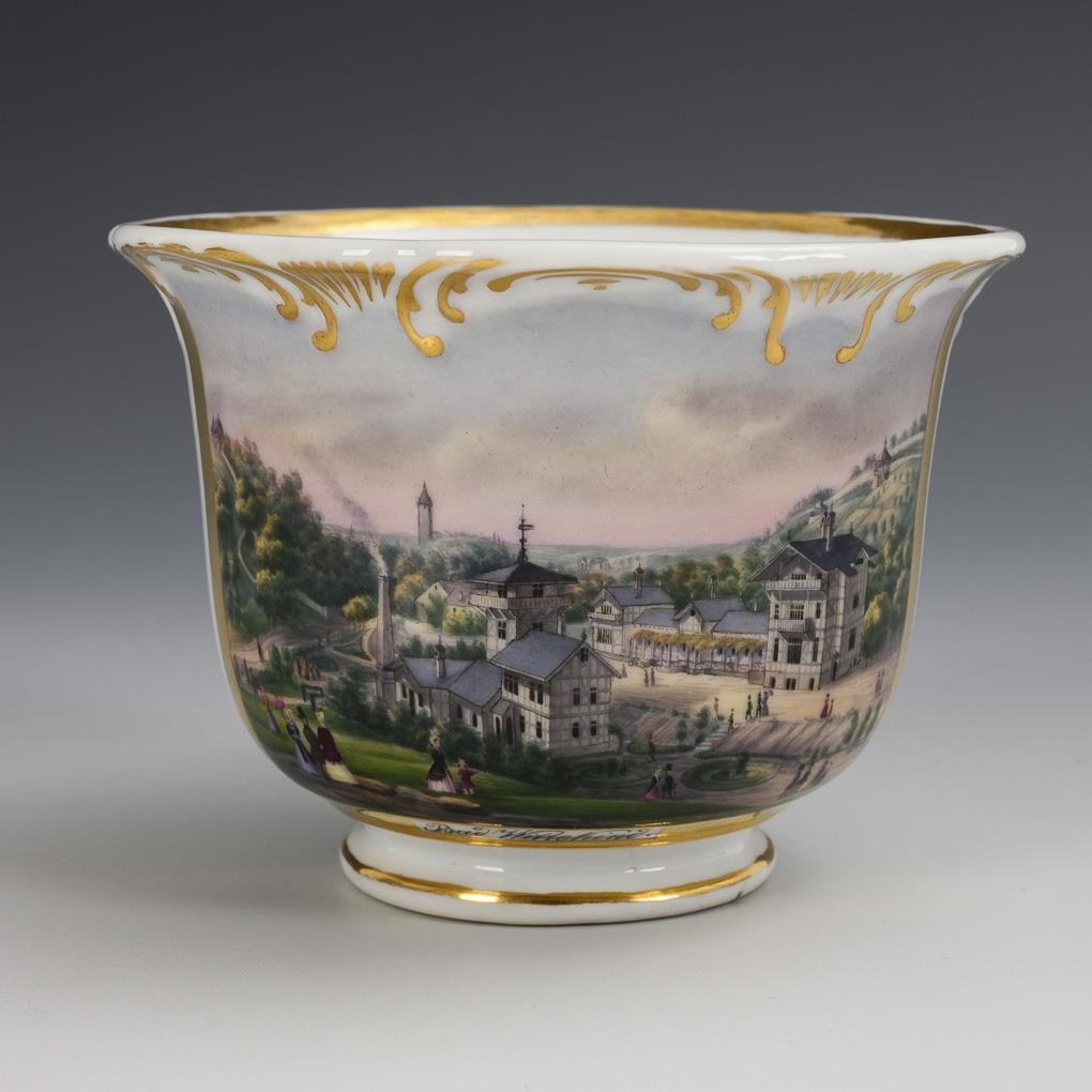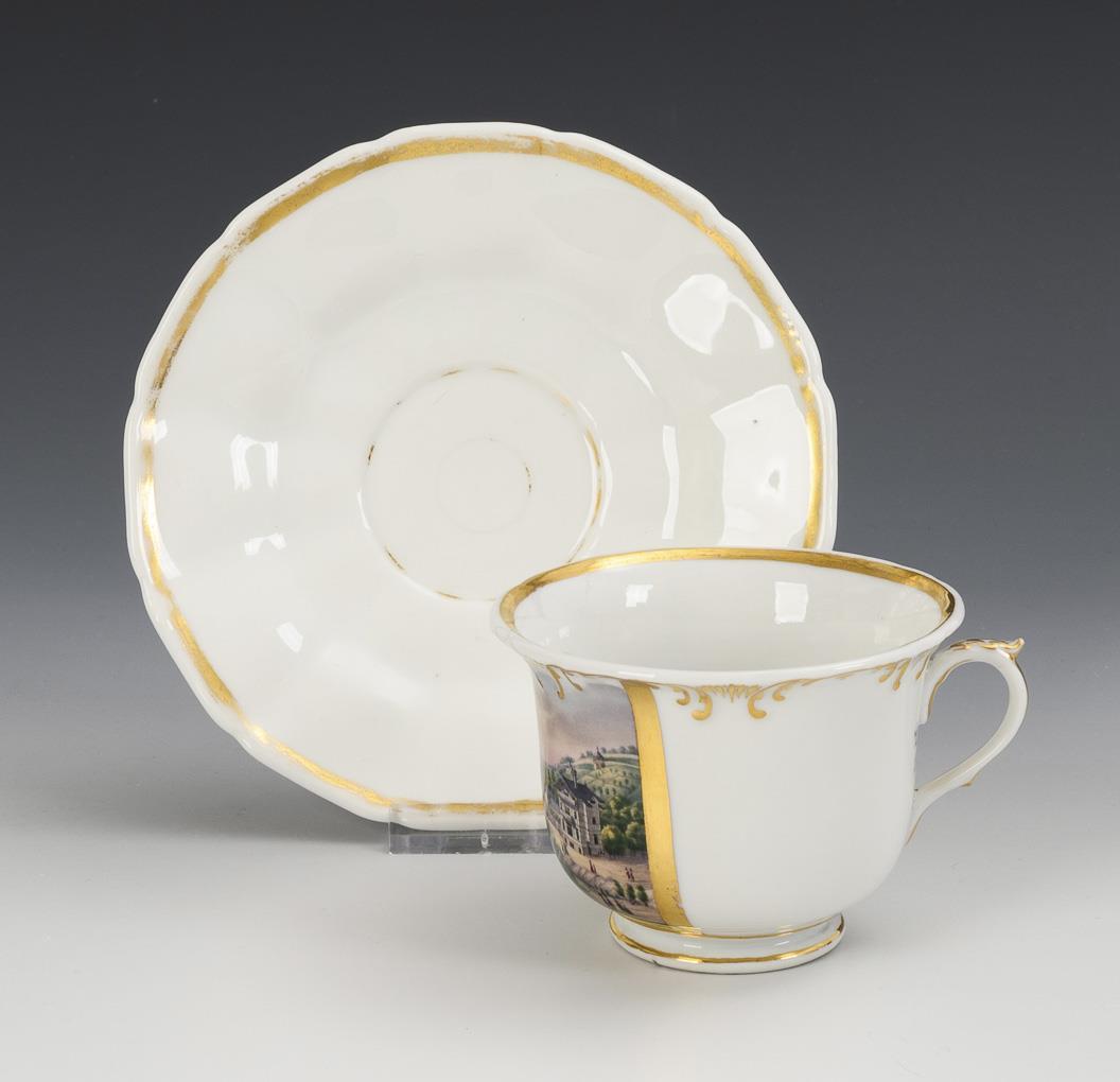 Bell-shaped cup with rocaille rim and ear-shaped handle. On the front a gold-framed rectangular cartouche with the inscribed view of Bad Wittekid near Halle (Saale). Saucer with hairline spider and gold abrasion.