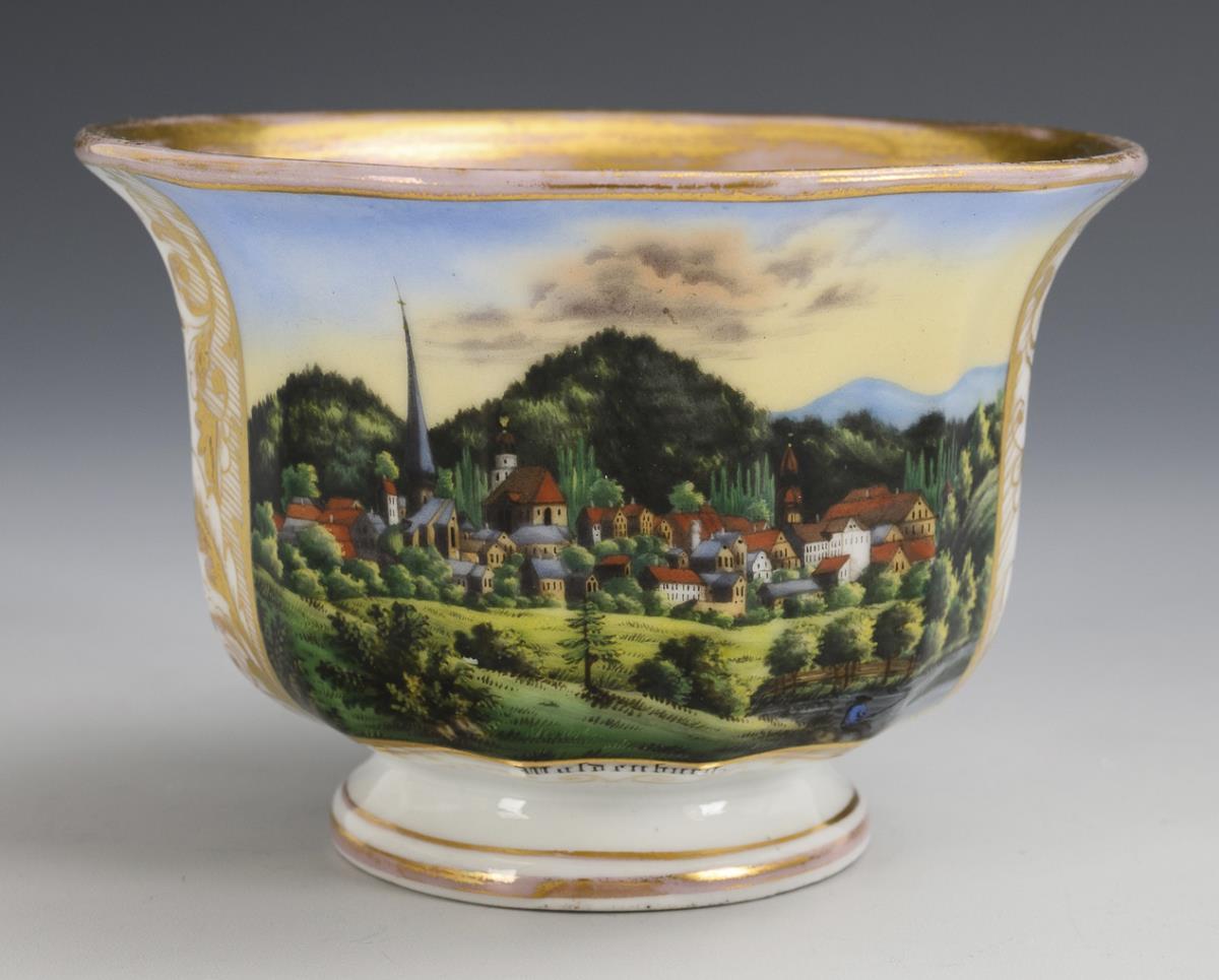 Footed, polygonal bell-shaped cup with tapering handle. On the front a gold-framed rectangular cartouche with the inscribed view of Waldenburg, on the reverse floral gold painting. Partial gold abrasion.