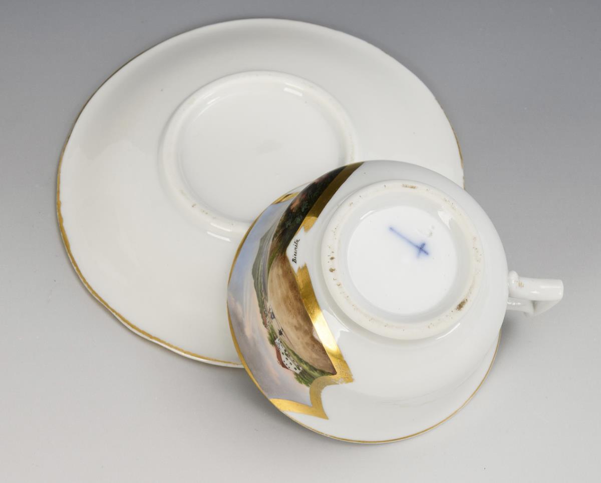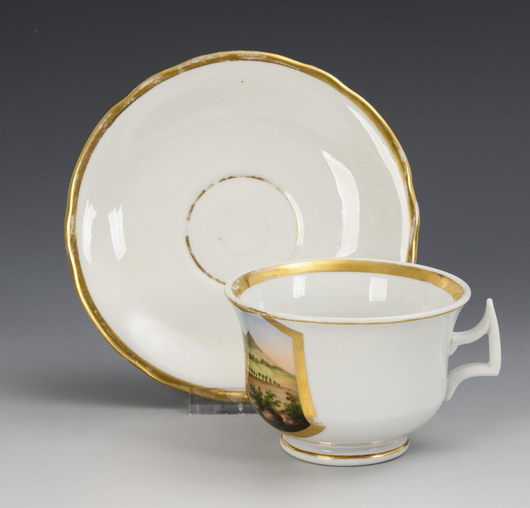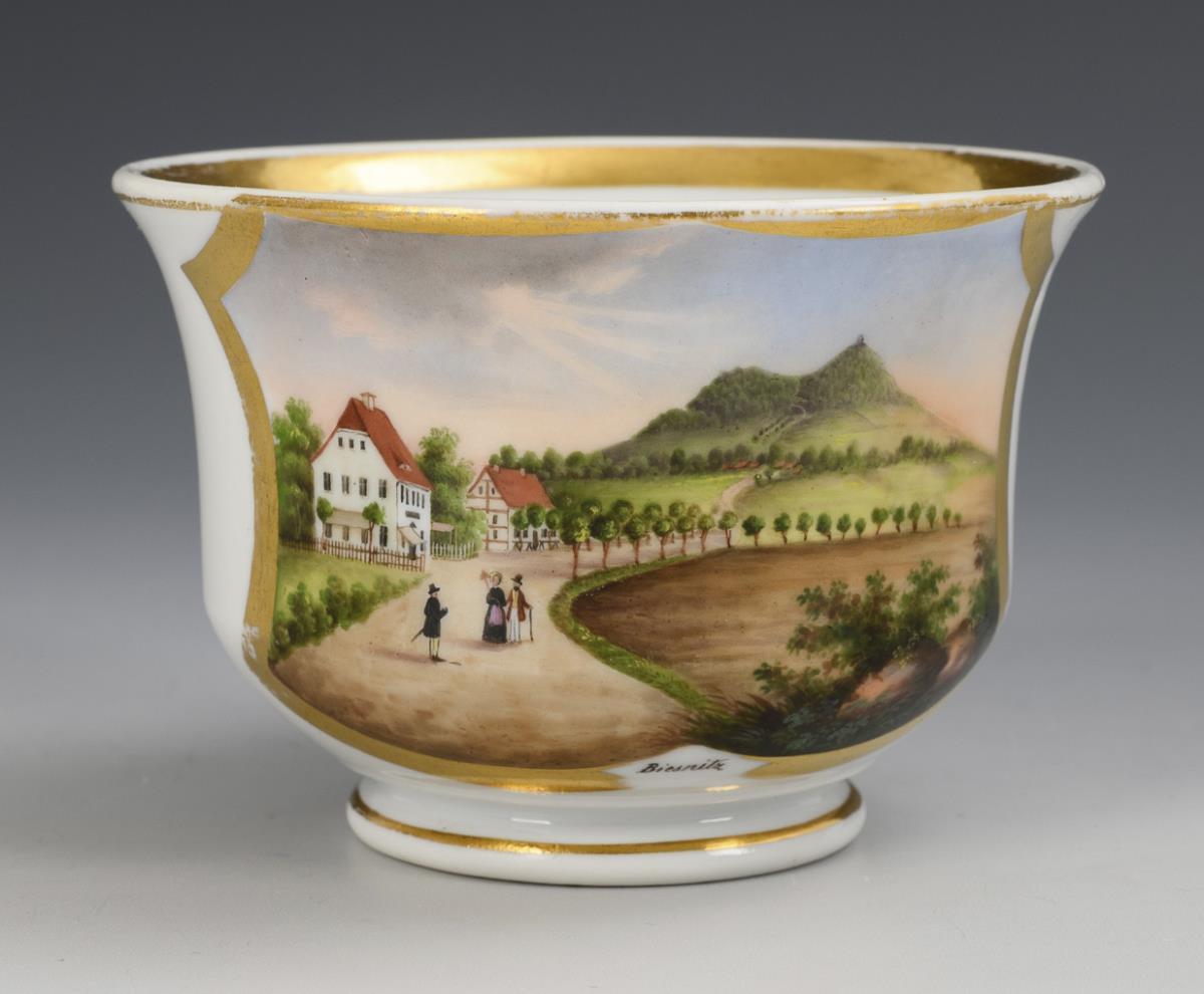 Footed bell-shaped cup with tapering handle. On the front a gold-framed rectangular cartouche with the inscribed view of Biesnitz near Görlitz. Partial gold abrasion.