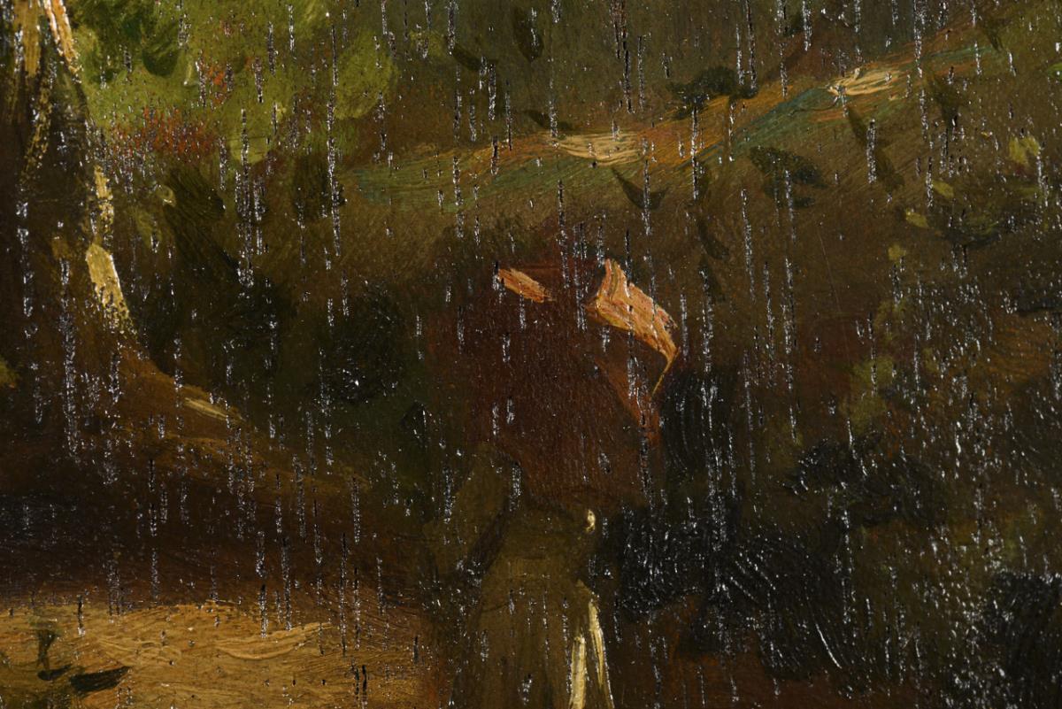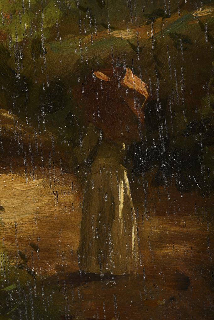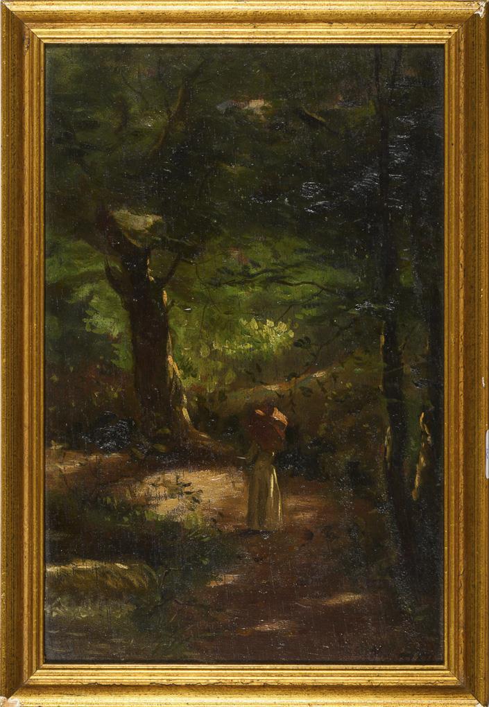 Forest interior with a woman in a white dress and with a red umbrella in the incoming sunshine.