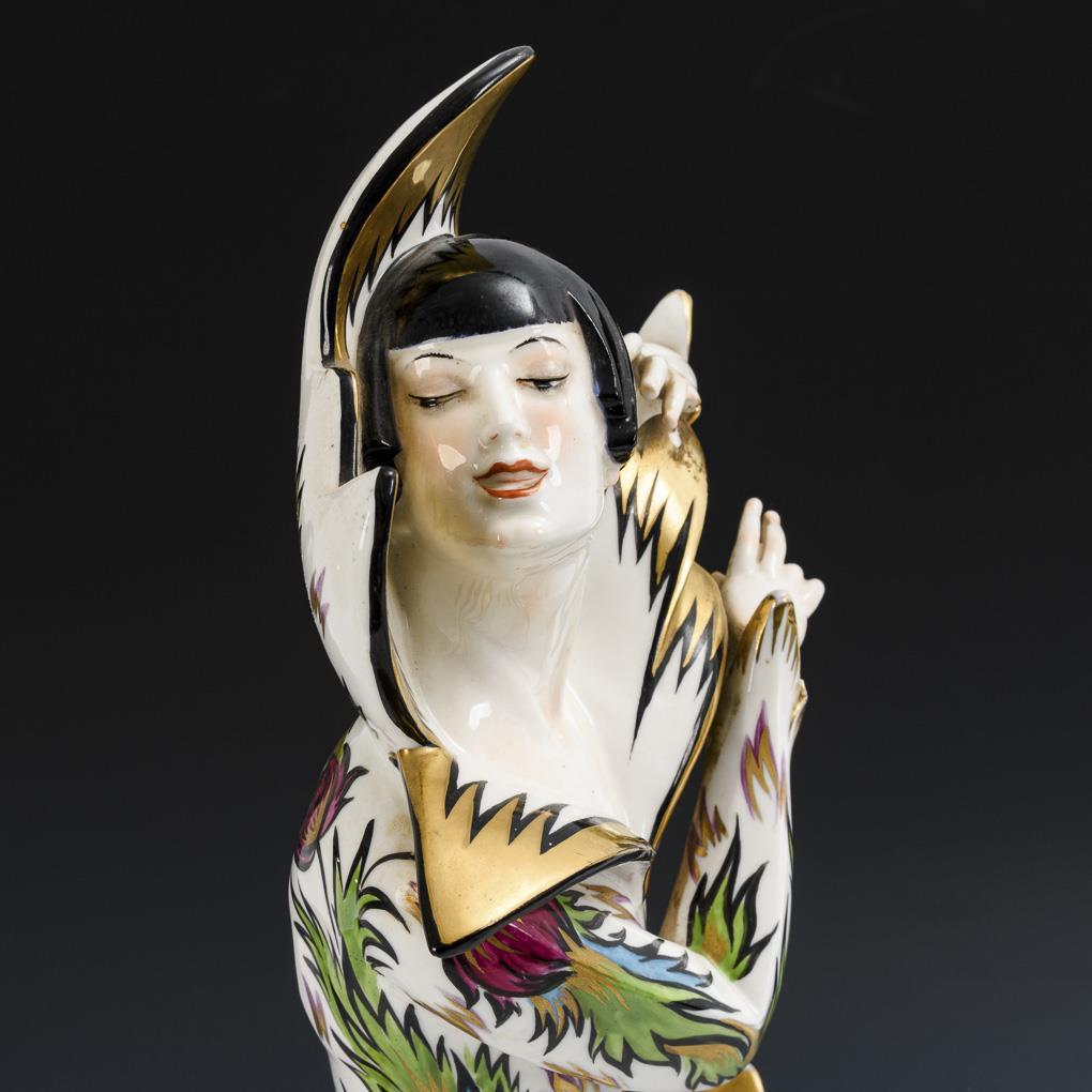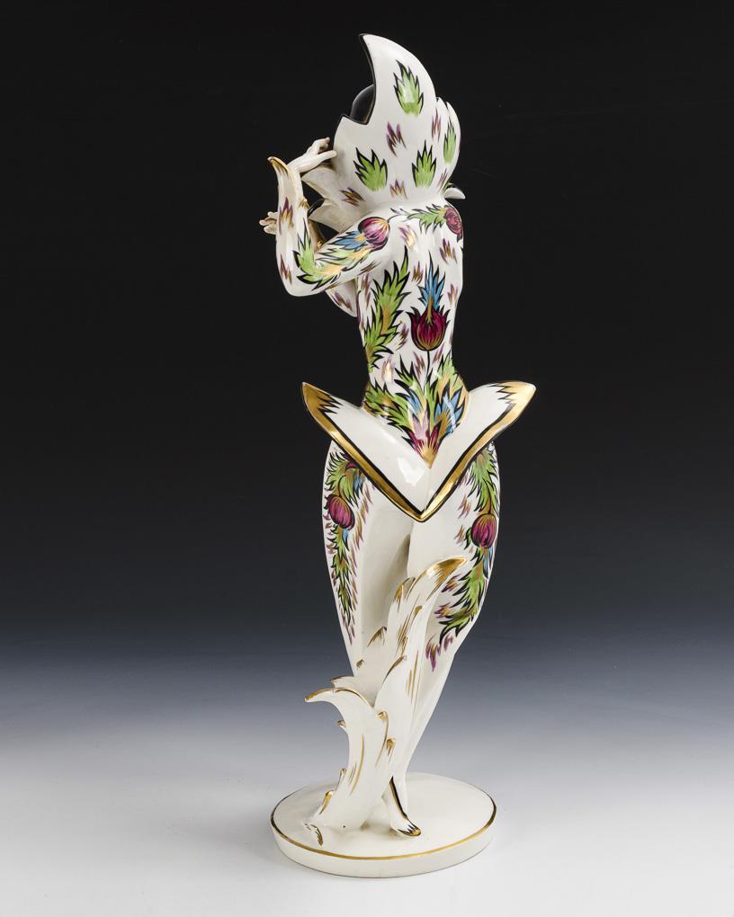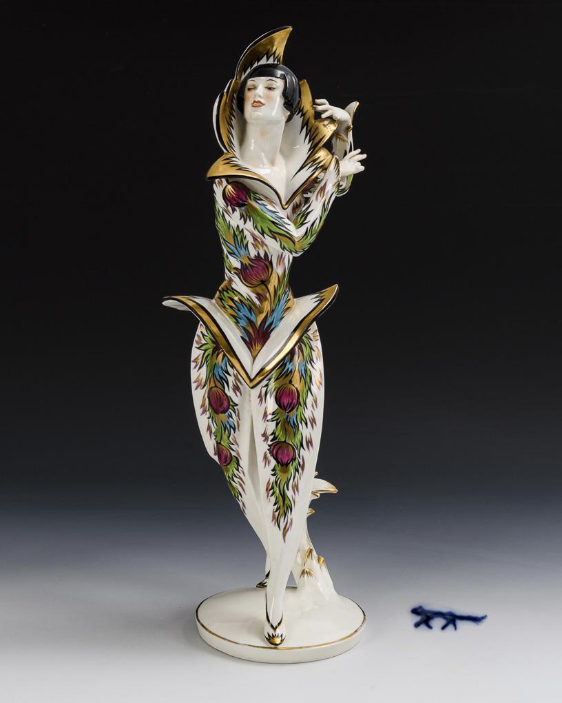 Expressive dancer standing in dance step. 3 fingers and 1 tip of the leaf chipped, minimal gold wear.