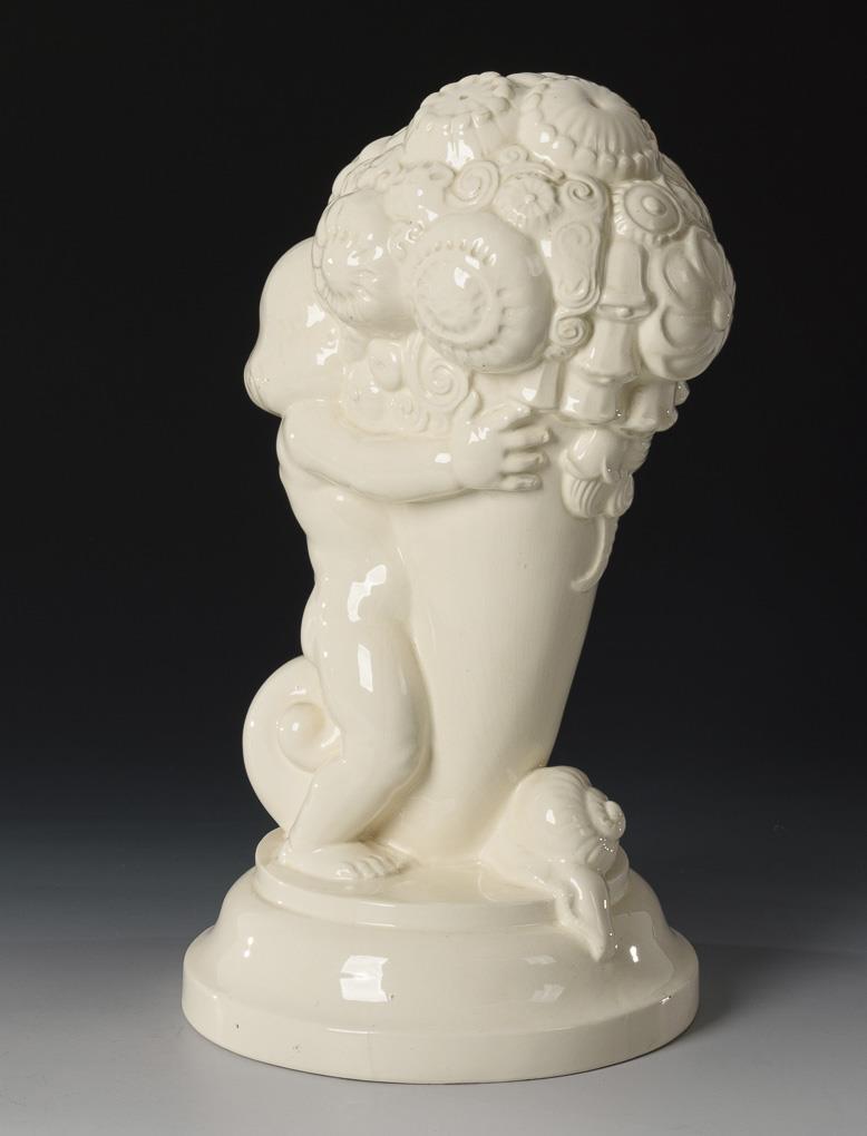 Designed under the influence of the Viennese School, a putto with a large horn filled with flowers and a scroll, on a round base. Minimally glaze cracked.