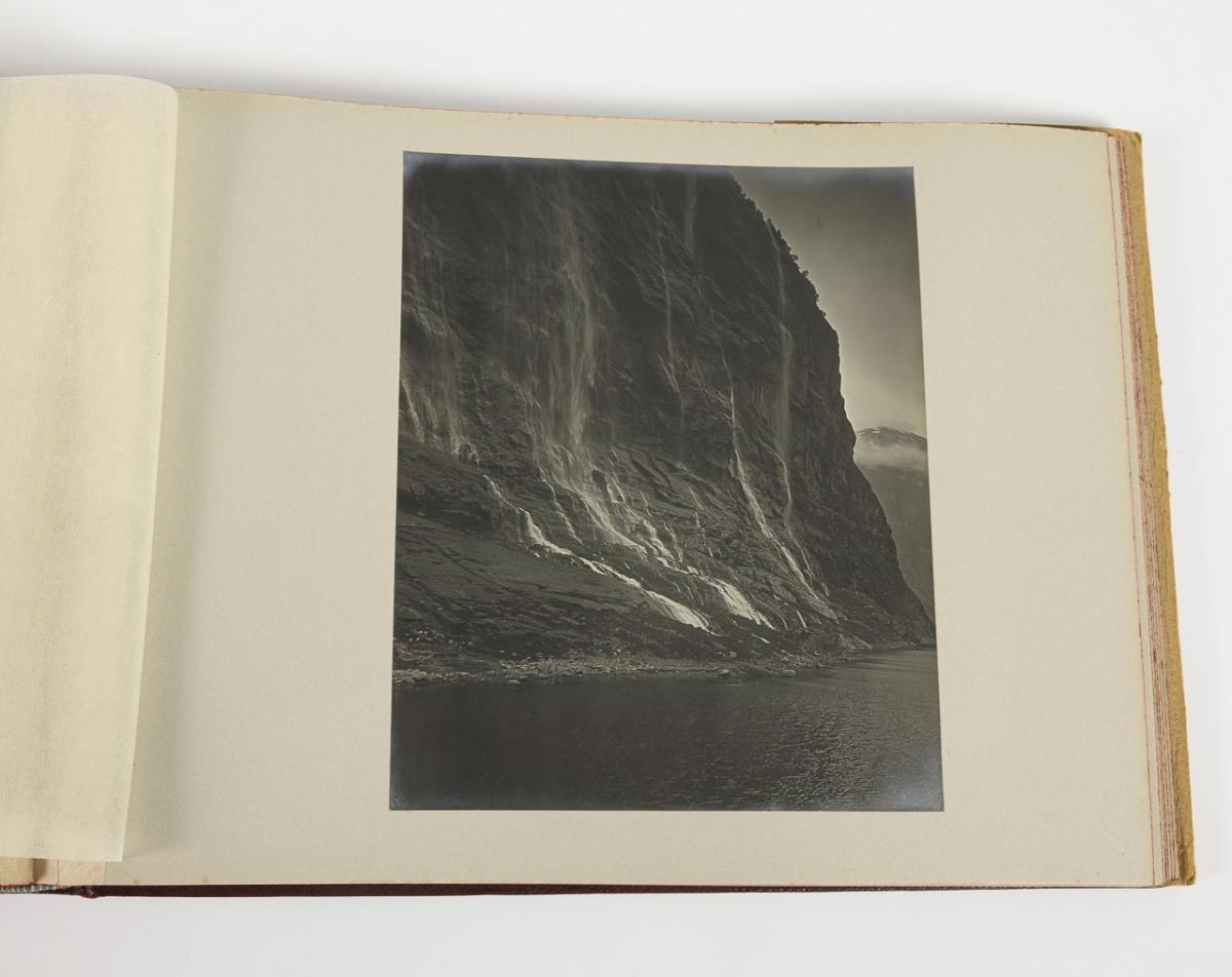 Titled "Nordlandfahrt der Großeltern" on the dust jacket. In the photo album large glued-in photos with the captain, the traveling couple in front of various motifs, numerous photos of the passenger group in front of various motifs (fortress, mountains, fjord, Horgheim station. Glacier tongue, railroad station or in the inn), various on-board scenes, women in traditional costume in front of a photo store in Bergen/Norway, various landscapes, including photos of the steamer to the 7 waterfalls in Geiranger Fjord.