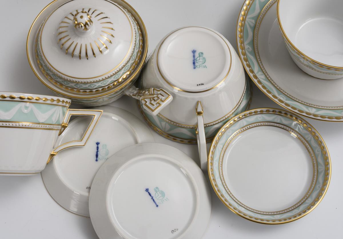 14x with mint green background band and gold decoration: 5 coffee cups, 1 demitasse cup, 2+1 saucers, 1 breakfast plate, 1 saucepan and 3 nut bowls. / In addition, three white pieces: sauce boat (L 24.5 cm) and 2 small bowls (Ø 15.5 cm).