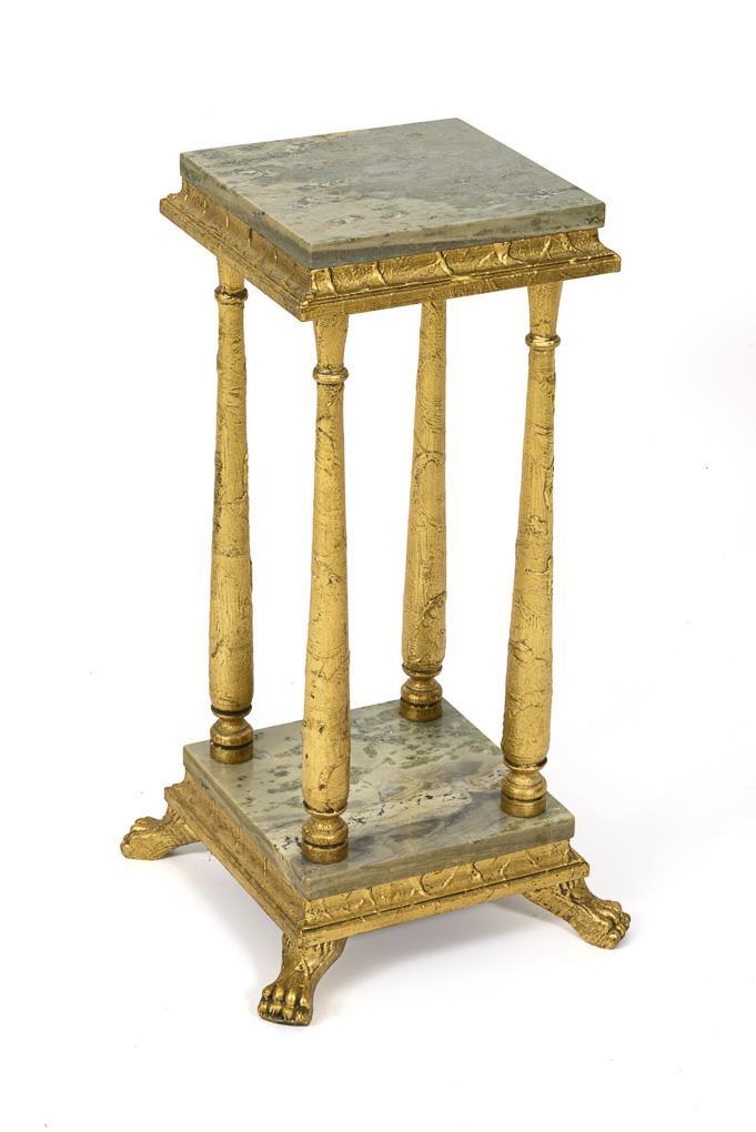 Stuccoed, gold-bronzed wood, grayish-green marble. H approx. 66 cm, top plate: approx. 25 x 25 cm.