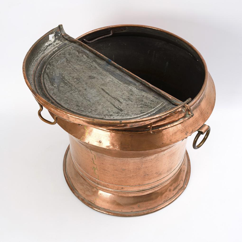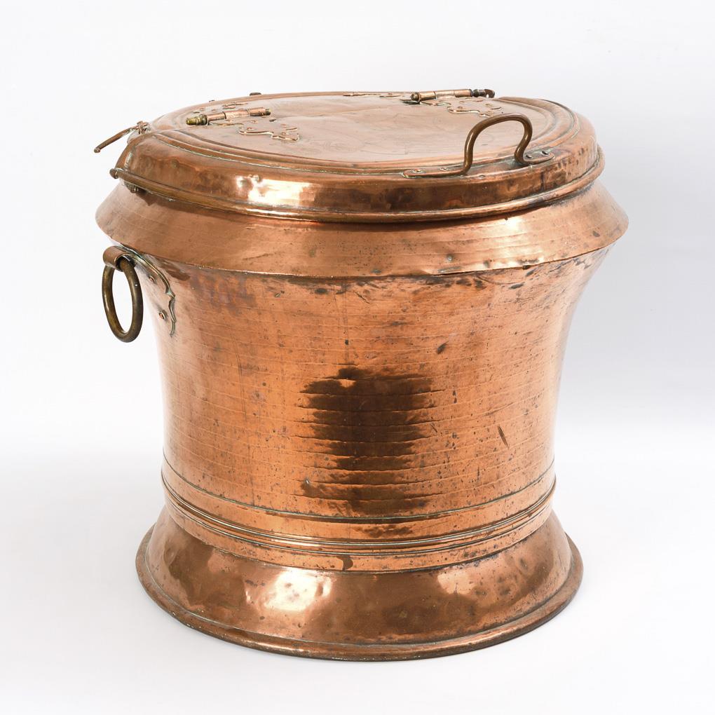 Copper, tinned inside, brass ring handles and hinge pins, iron holder inside. H 59 cm, Ø 65 cm (each without handles). 20.5 kg.