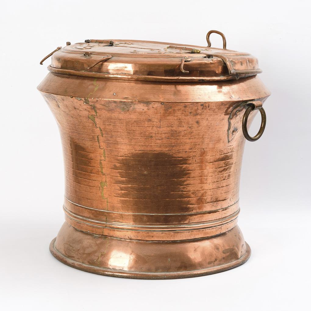 Copper, tinned inside, brass ring handles and hinge pins, iron holder inside. H 59 cm, Ø 65 cm (each without handles). 20.5 kg.