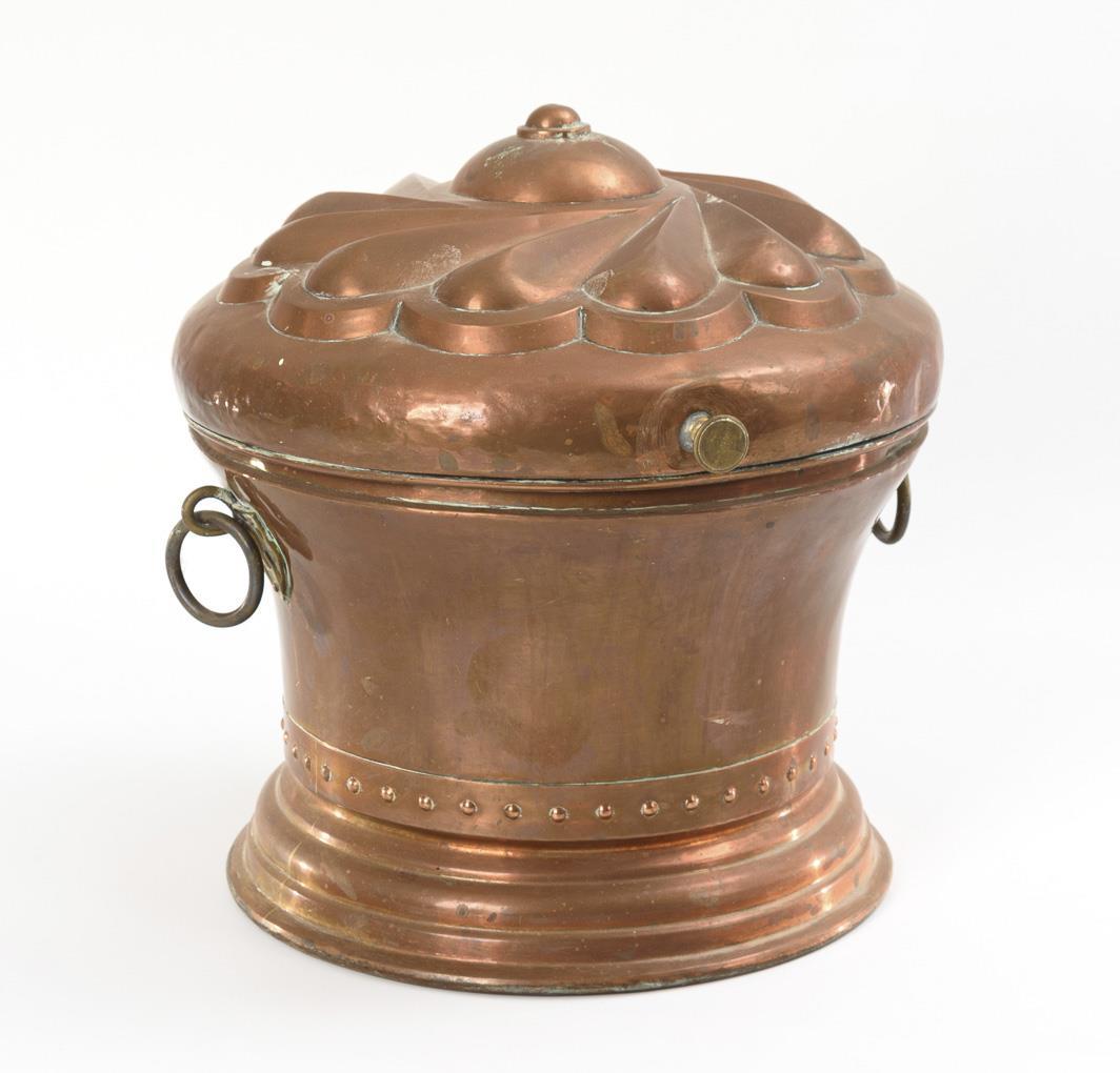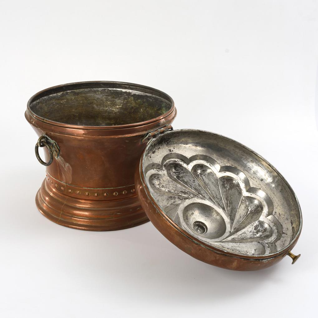 Round body with profiled foot ring and swirl relief on the hinged lid as well as 2 ring handles on the sides. Old traces of soldering on the foot, lime deposits inside, few signs of age/use.