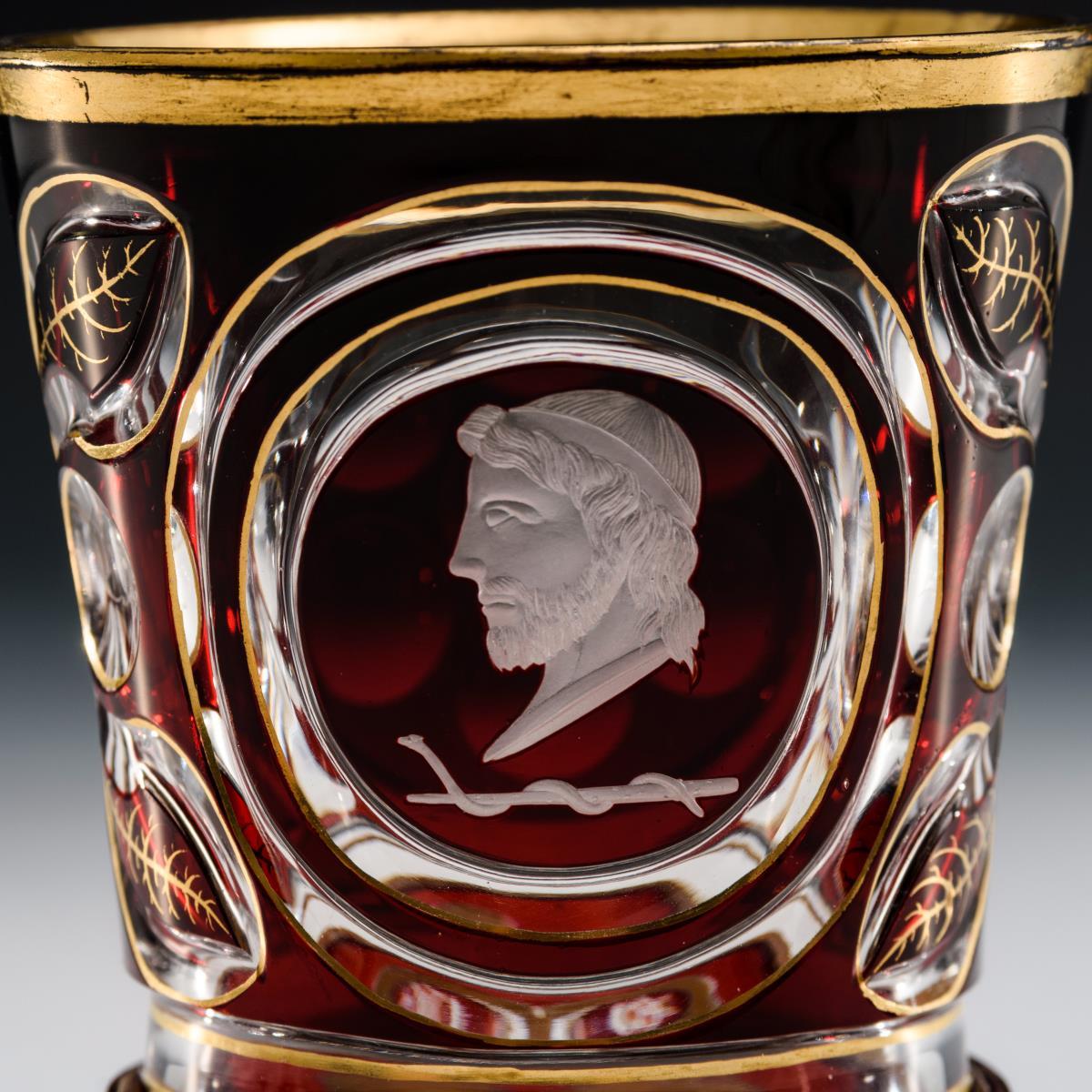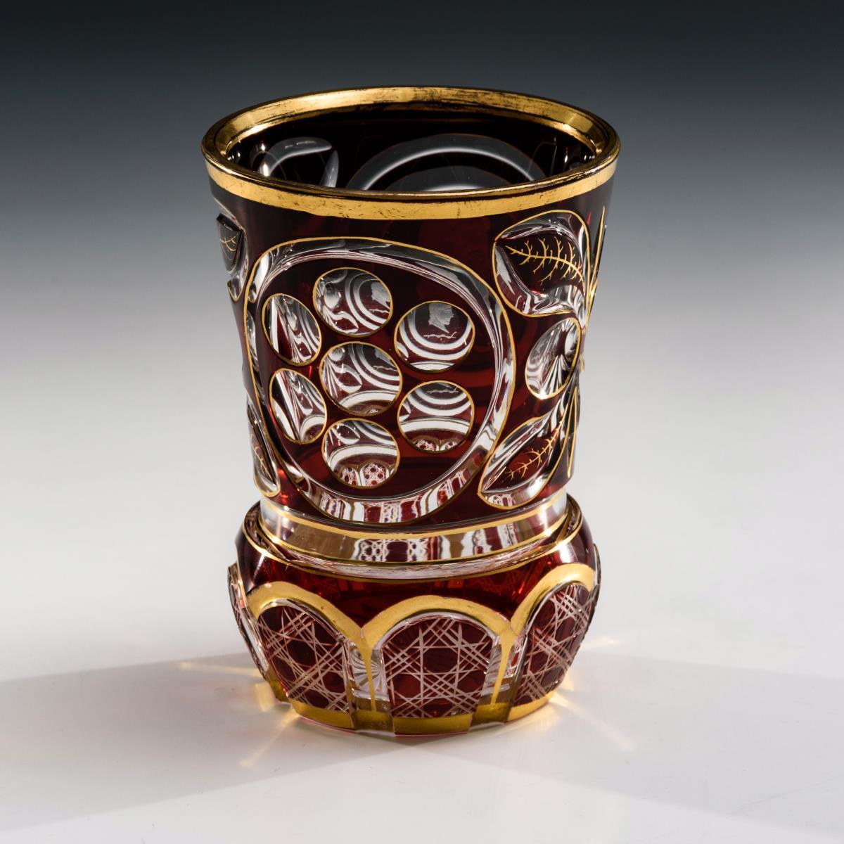 Farbloses Glas mit rotem Überfang, goldstaffiert.