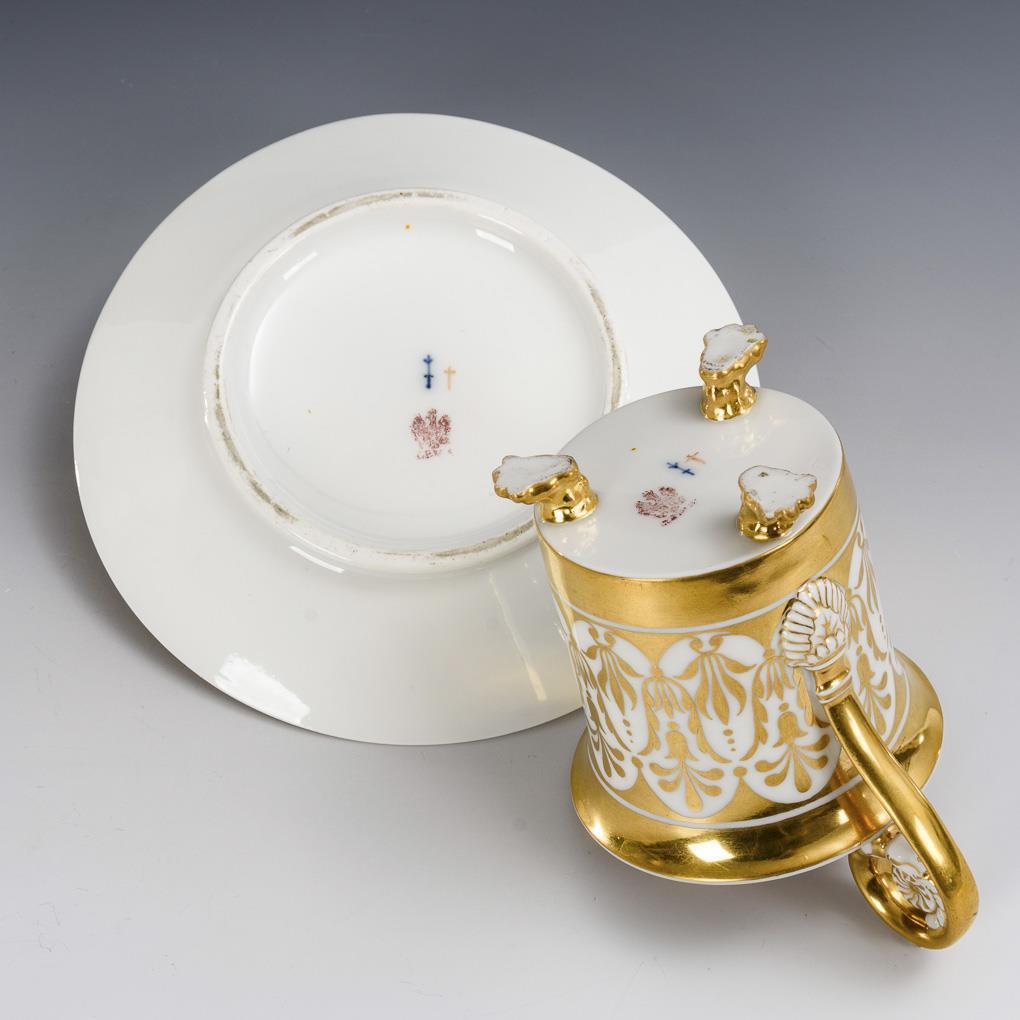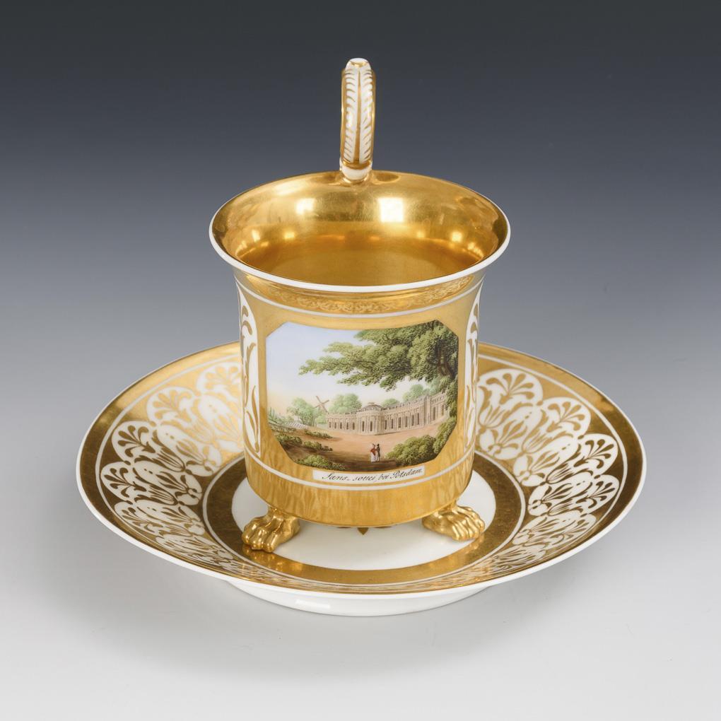 Polychrome painted, decorated in gold. Cup (h 13.5 cm), saucer (Ø 18 cm).