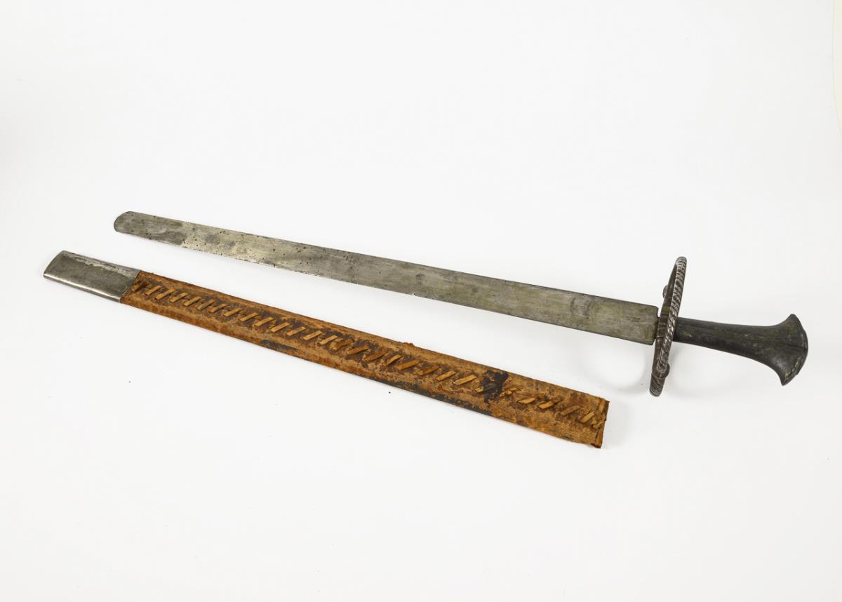 Authentic 19th century replica. Double-edged blade rounded at the front, quillons in the shape of a figure eight. Conical iron grip. In leather sheath.