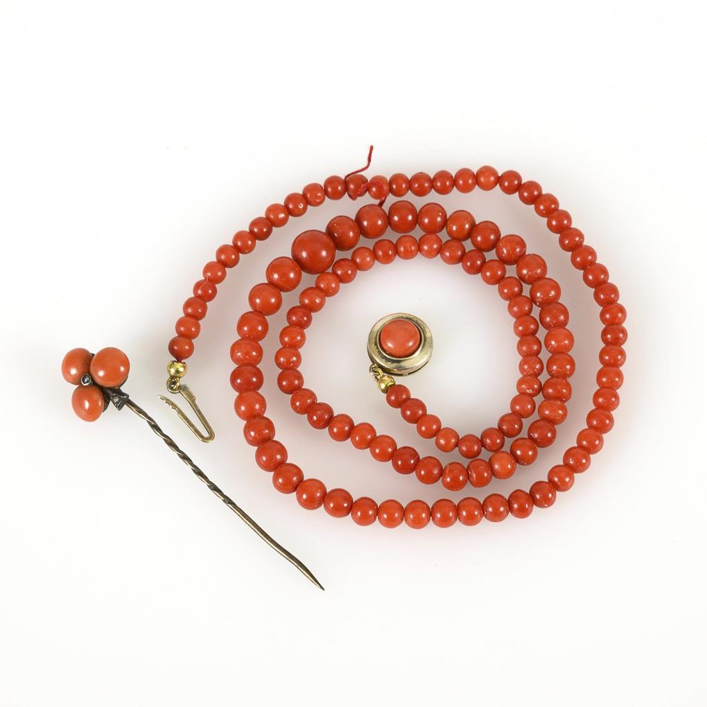 Cord necklace with coral beads in a gradient, on decorative clasp. Pin with 3 coral lenses.