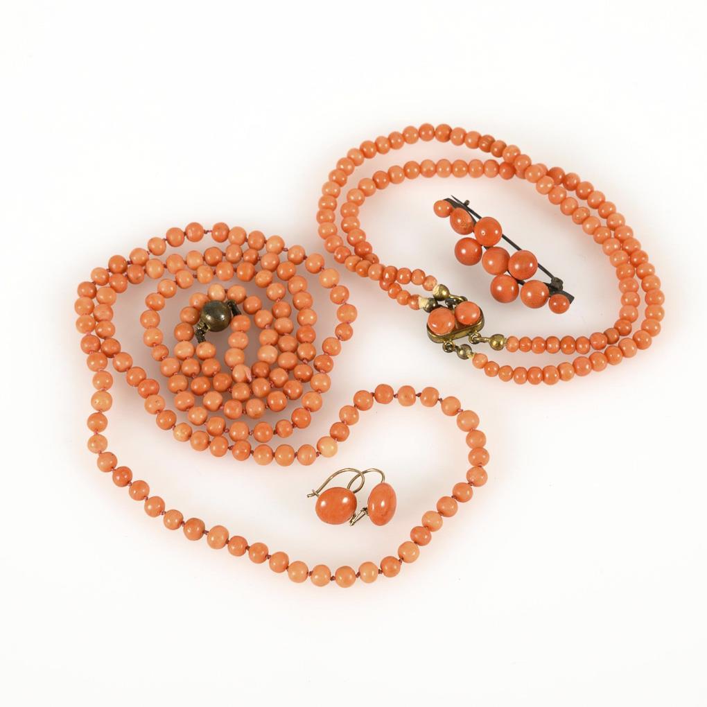 Cord necklace with small coral beads in single knots, on a ball clasp. 2-row bracelet on a box clasp. Brooch and pair of earrings with coral lenses. Hook clasp.