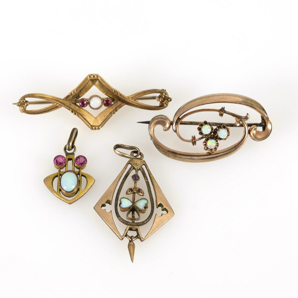 2 pendants typical of the style and 2 brooches with small opal cabochons and imitations. Hook clasps.