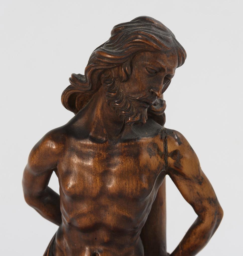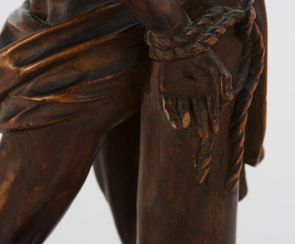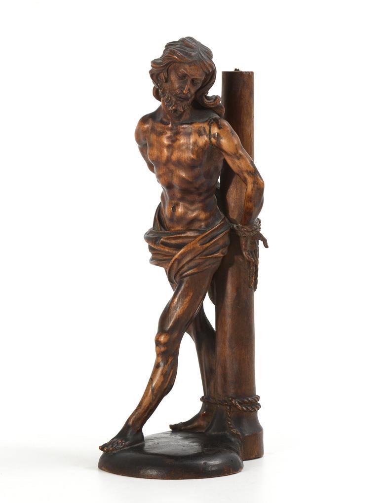 Anatomically accurate and detailed carving of the Savior's upper body and slightly elongated proportions. Jesus stands tied to the column and turns to the side in pain, putting one leg out wide. Carved from one piece. 1 finger missing, traces of glue, crowning of the column missing.