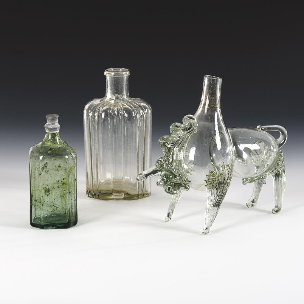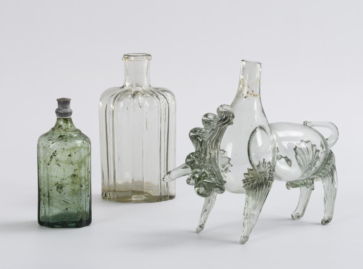 1x 18th century: square bottle made of green glass with numerous inclusions and tin-mounted screw cap; demolition (h 15 cm). / 1x 2nd half 18th/19th century: multi-pass bottle made of colorless glass with folded rim; demolition (h 18 cm). / 1x 19th century: joke bottle in the shape of a bull made of colorless glass (H 20 cm, L 23 cm). Chip on the mouth rim of the joke vessel.