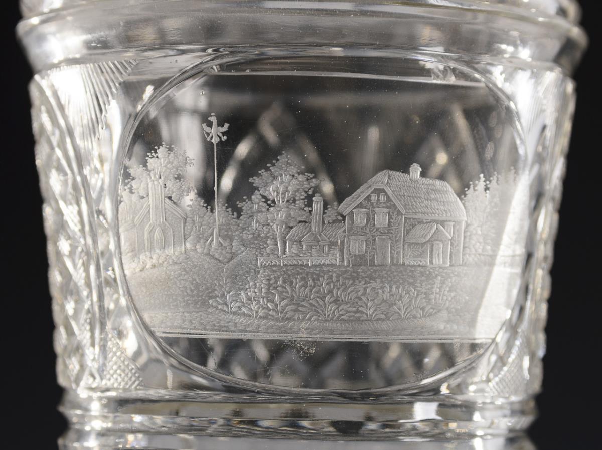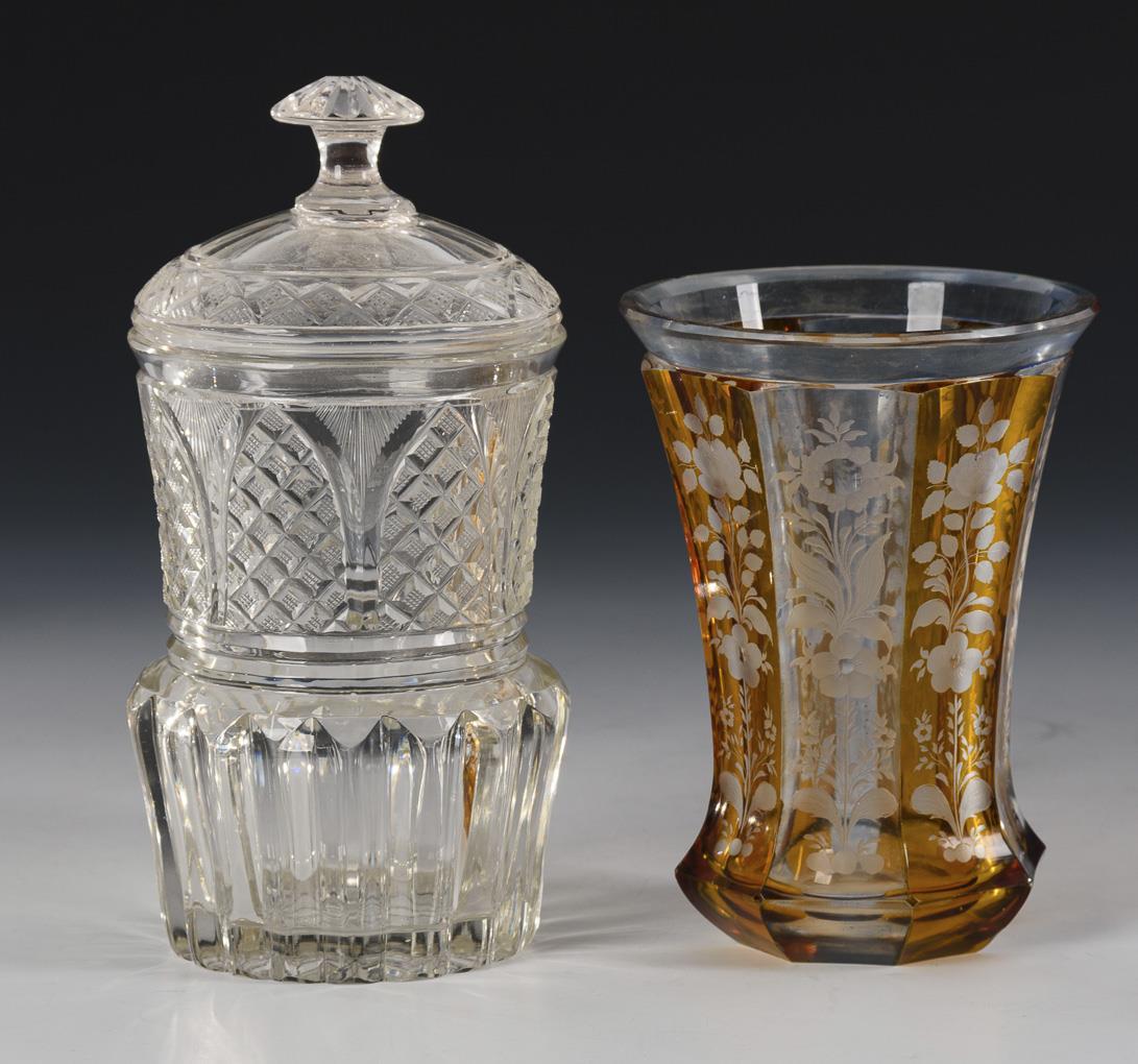 1x eight-facetted Ranft beaker made of colorless glass, partly stained yellow and light blue, with floral engraving (h 13 cm). / 1x lidded beaker made of colorless glass with stone and notch-cut decoration and a village view engraved on the front (h 17 cm). Ranft beaker with minimal rim chips, chip on the rim of the lid, small chip on the base of the lidded beaker.