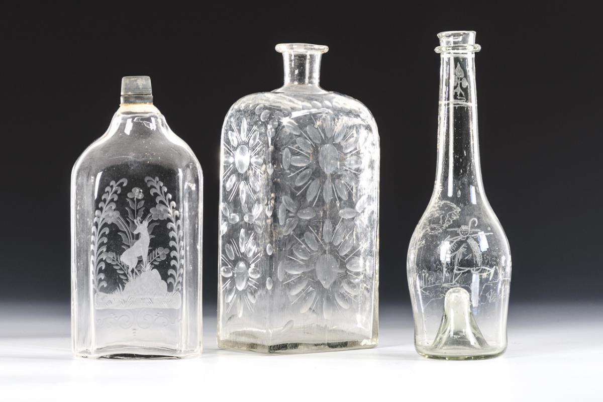 Square bottle with floral cut; demolition (h 23 cm). / Square bottle with hunting and floral engraving and pewter screw cap (H 20 cm). / Slender bottle with raised base and figural engraving (H 23 cm). 1x stress cracks in the raised base.