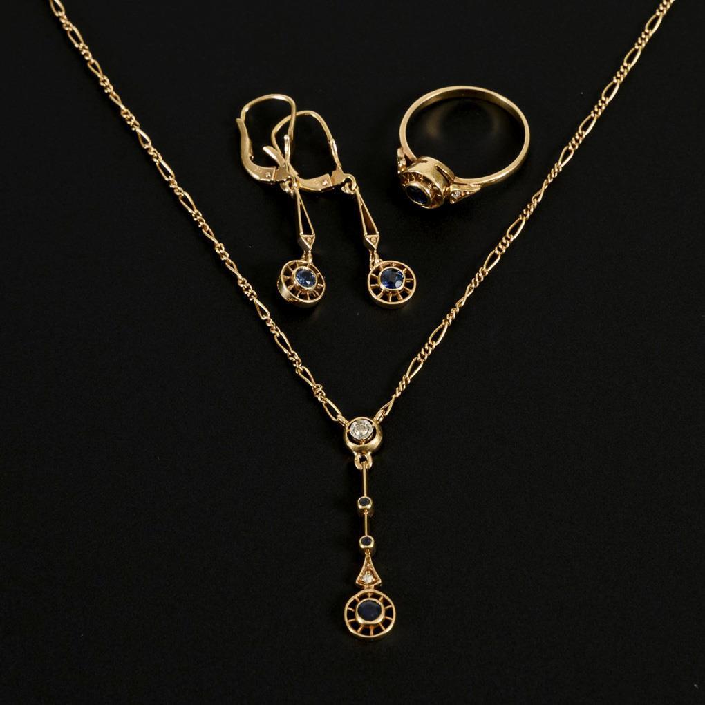 Necklace, ring and pair of earrings with bezel-set sapphires and small diamonds. Armored Figaro necklace probably supplemented, narrow bar, spring shackle.