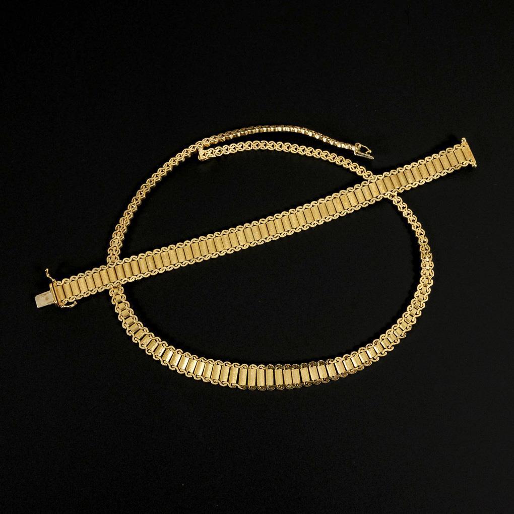 Stamped 585 yellow gold. Chain L 44 cm (center 1 cm). Bracelet 19 x 1.1 cm. 32,8/27,5 g.