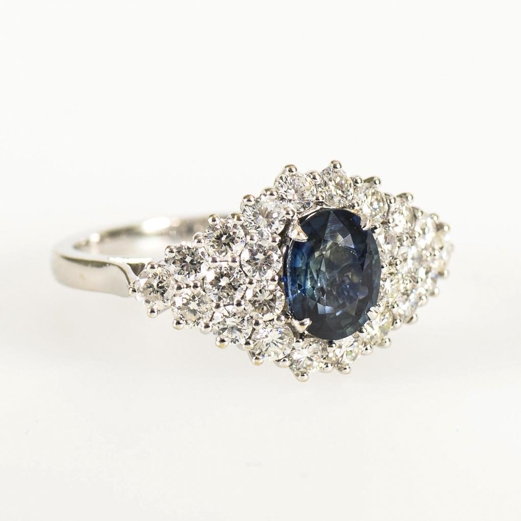 Stamped 750 white gold. Sapphire 7.85 x 6.18 x 3.90 mm. Approx. 1.51 ct. Diamonds in total approx. 1.00 ct. Ring size 54. 6.1 g.