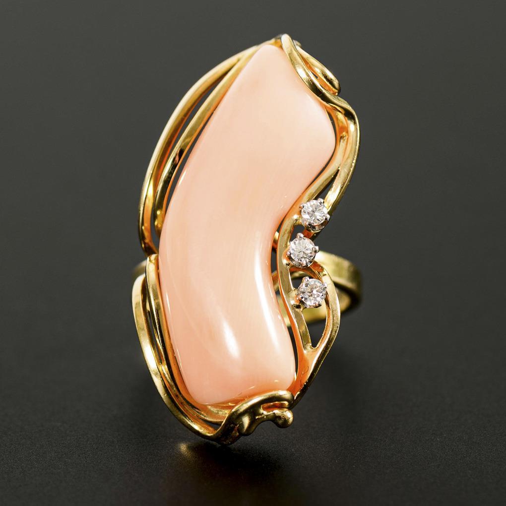 Handcrafted ring with angel skin coral segment and 3 small, chaton-set brilliant-cut diamonds, on a central bar.