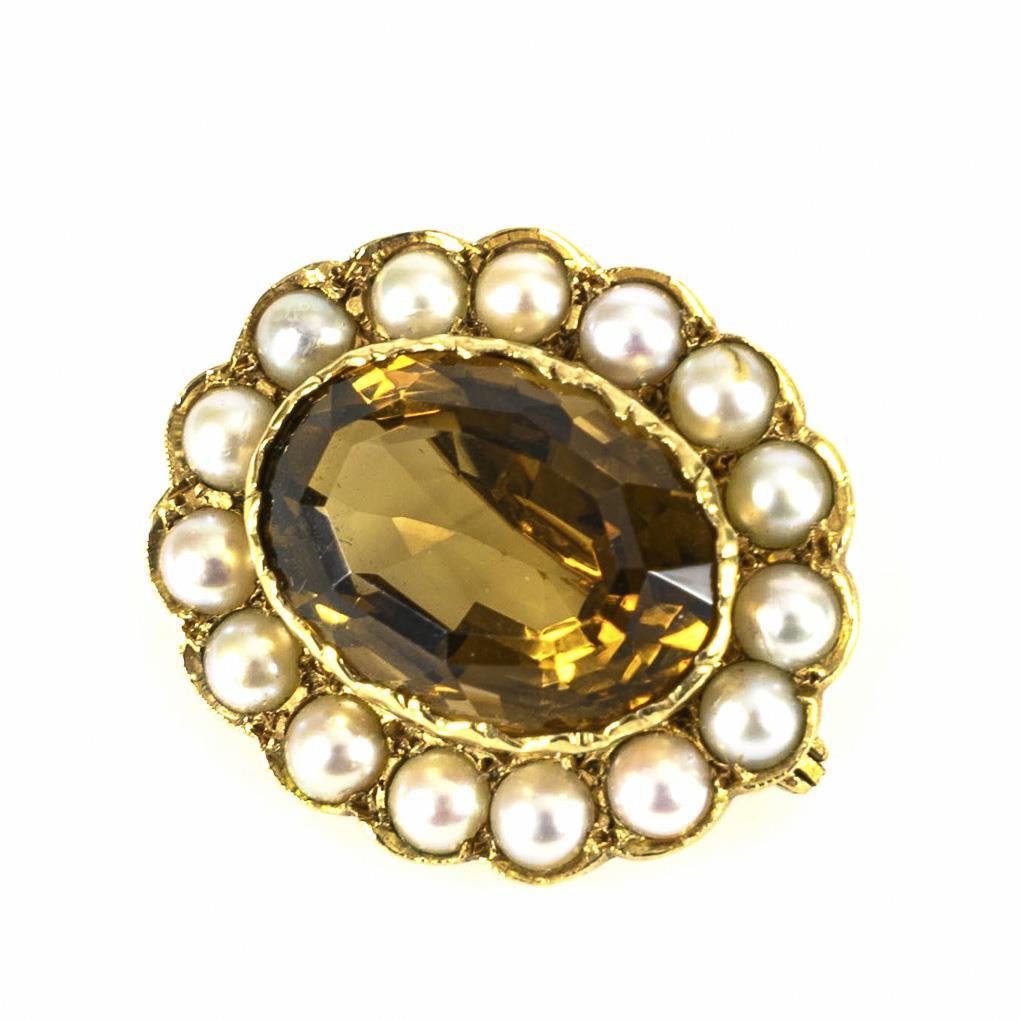 Tested yellow gold 585. Smoky quartz 18.2 x 13.2 x 9 mm. Approx. 11.50 ct. Half pearls Ø approx. 4 mm. Brooch 2.75 x 2.4 cm. 9,8 g.