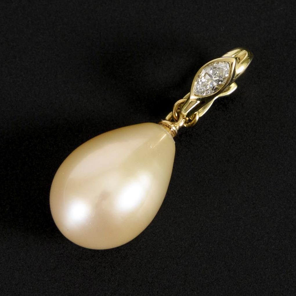 Marked yellow gold 585. Diamond approx. 0.17 ct/TW-G/si. Cultured pearl 16.6 x 11.5 mm. Pendant L 2.8 cm. 3,8 g.