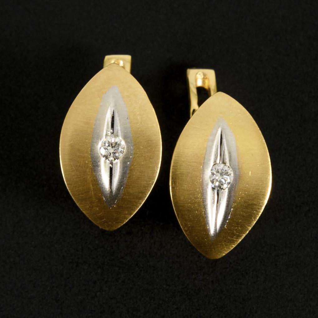 Marked 750 yellow gold/white gold. Diamonds in total approx. 0.08 ct/white/PI. Stud earrings 1.4 x 0.9 cm. 5,9 g.