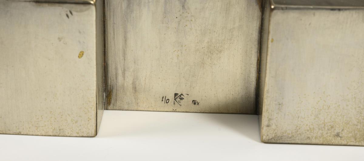 Exceptional, 3-flame candlesticks with cross-shaped base and hollow shaft with almond-shaped, faceted glazing. Signs of wear, spouts somewhat dented.