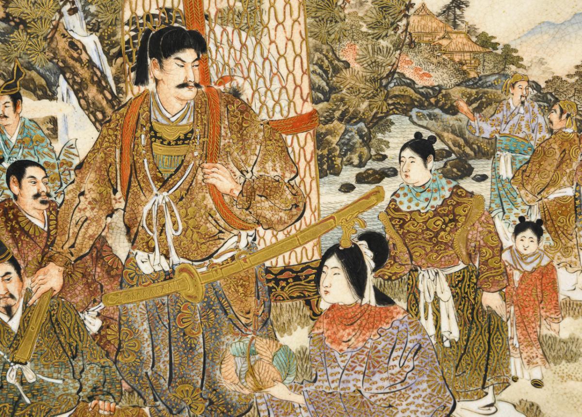 Heavy plate with ribbed and wavy rim. Finely painted large group of figures. In the center a samurai with a large pannier, surrounded by kneeling figures. Underside discreetly patterned and finely crackled.