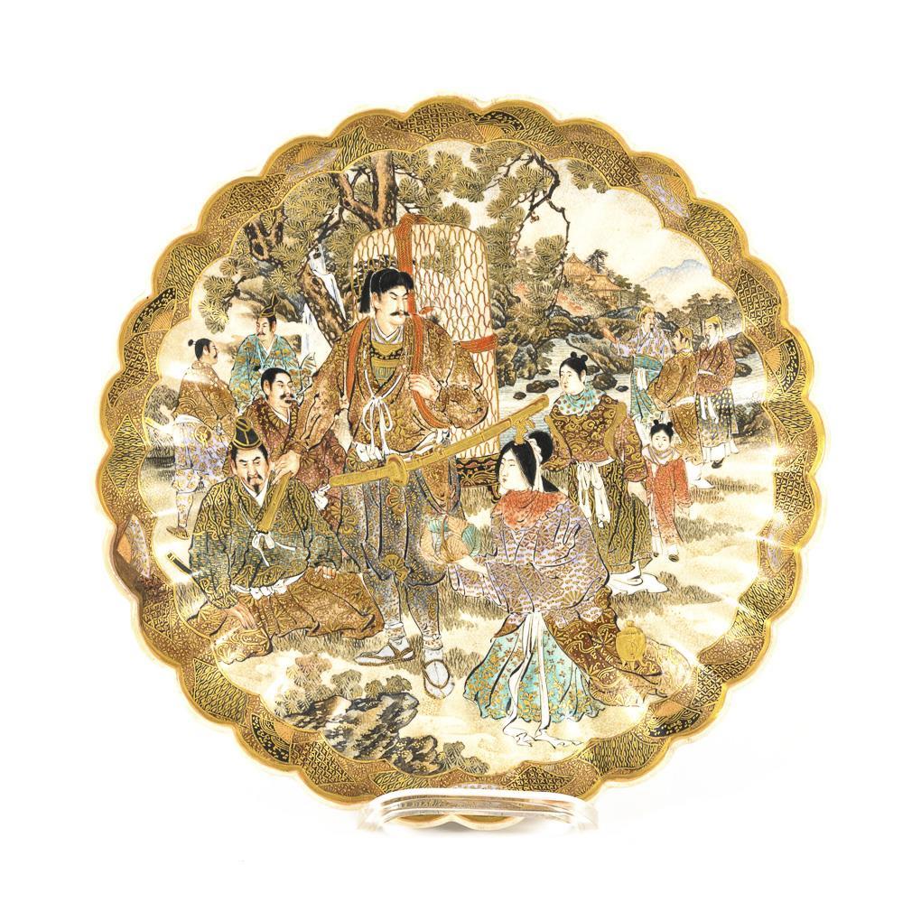 Heavy plate with ribbed and wavy rim. Finely painted large group of figures. In the center a samurai with a large pannier, surrounded by kneeling figures. Underside discreetly patterned and finely crackled.
