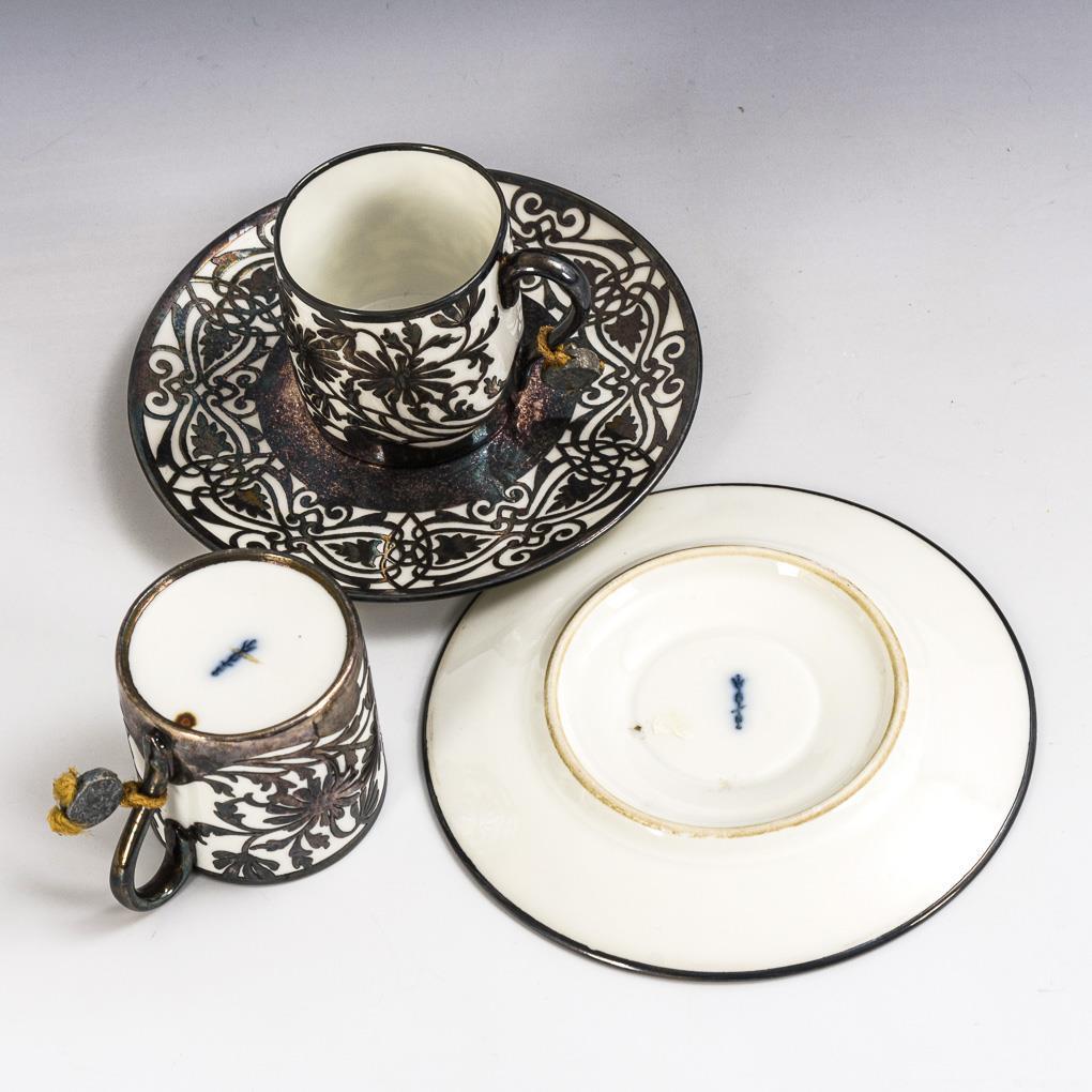 White with silver overlay. 2 demitasse cups (H 4.5 cm), 2 saucers (Ø 11.5 cm).