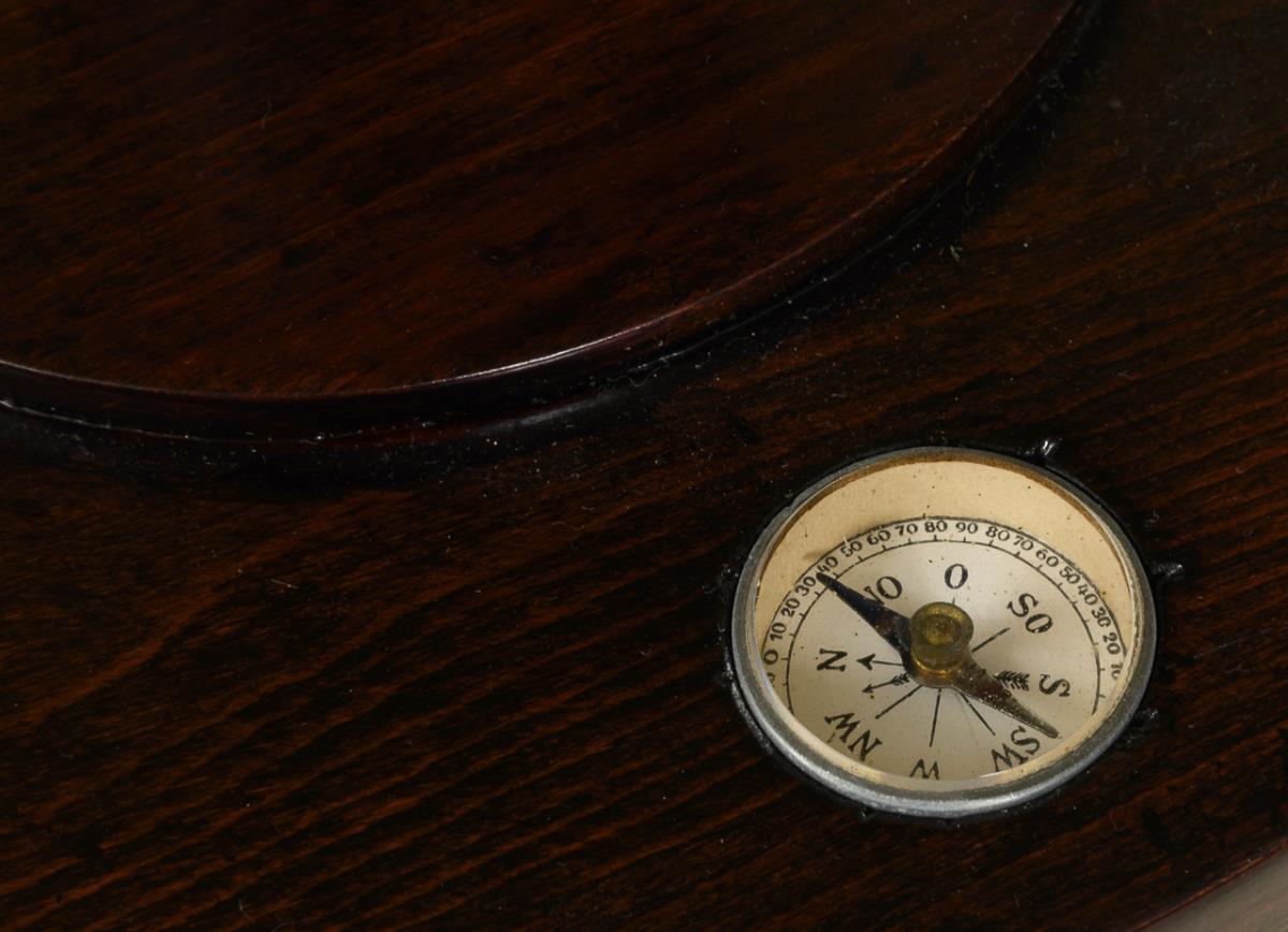 Standing globe on turned central support with round base, top plate with integrated compass. Globe with minor rubbing.