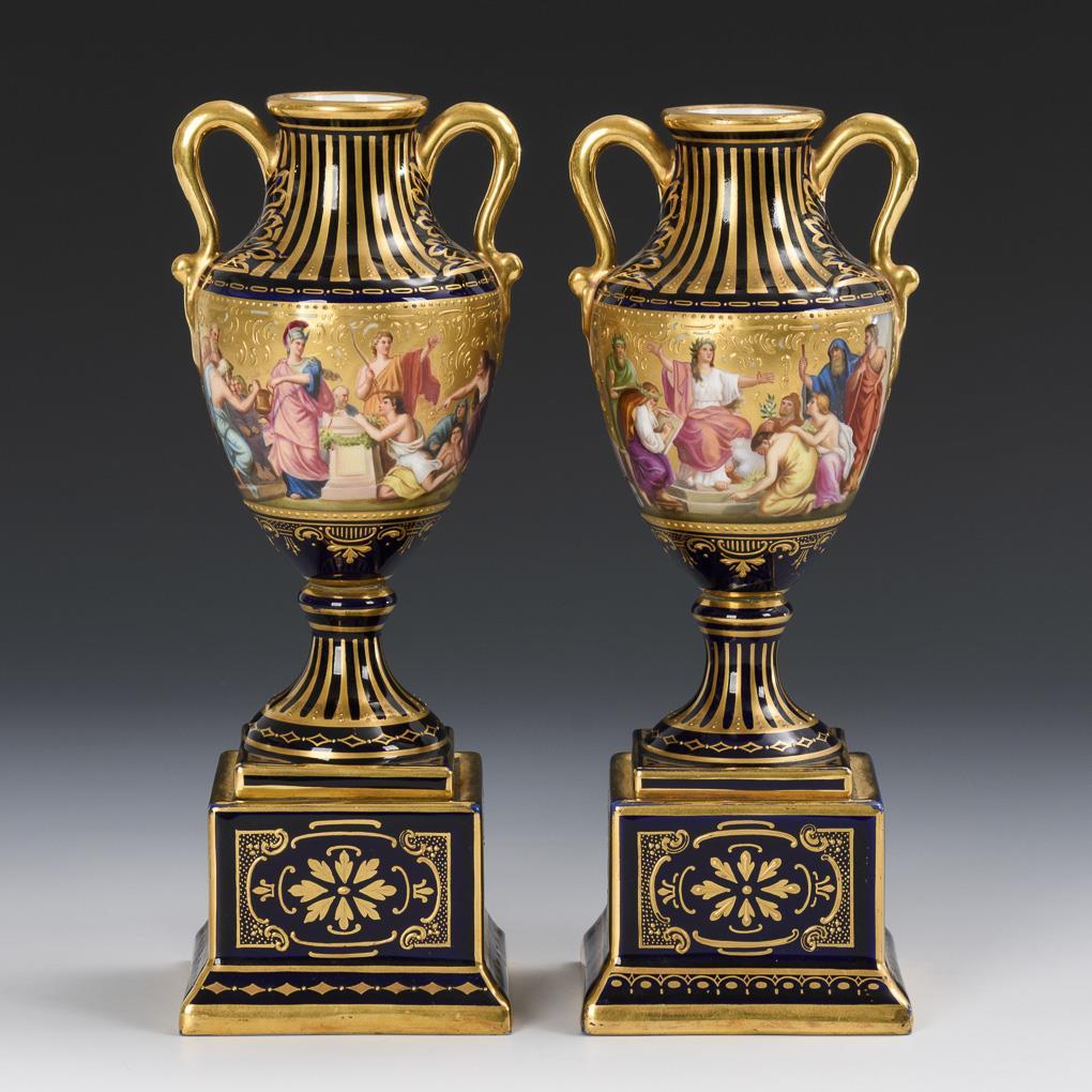 Semi-ovoid body, retracted neck, two curved handles, round foot; on a square plinth and square base. Cobalt background with rich ornamental gold painting, partly in relief; finely painted mythological scenes on the wall, indistinctly inscribed on the underside, against a gold background. 1x glued to the base of the body, minimal gold abrasion and some small losses to the gold relief.