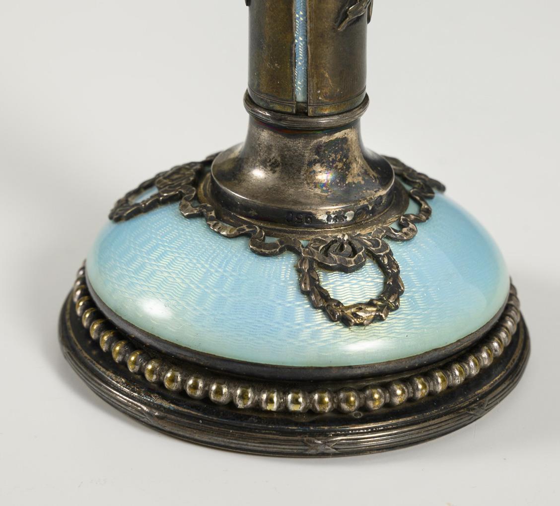 1-light candlestick with light blue enamel on guilloché ground. Spout dented, sleeve on shaft movable.