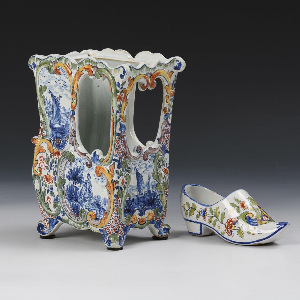 2 baroque Delft faience pieces: sedan chair and shoe.
