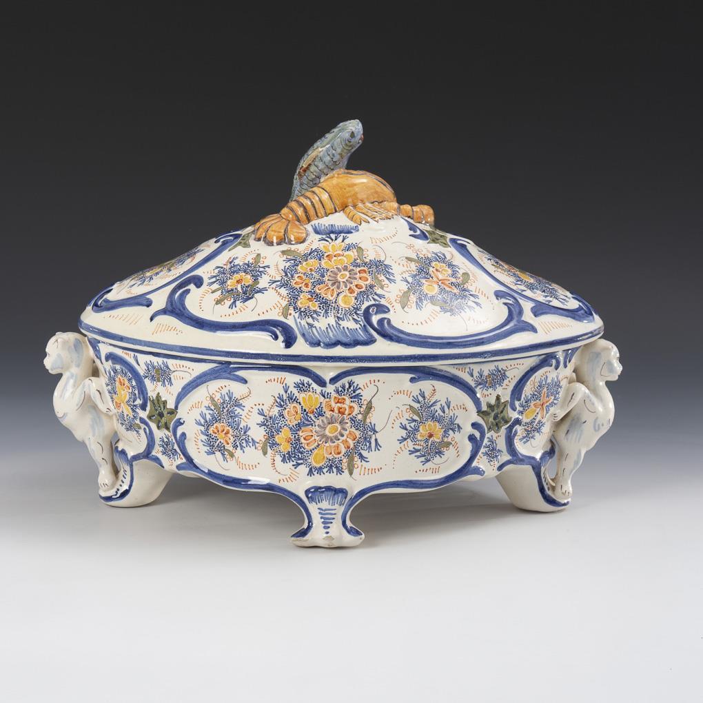 Oval relief bowl with animal sculptures on the sides, on 4 shell feet. Lid with sculptural knob as fish and lobster.